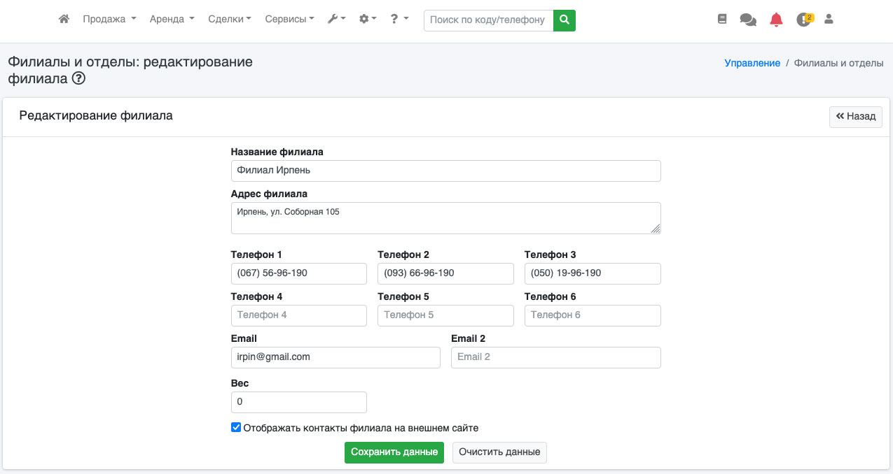 На сторінці, Вам необхідно вказати назву філії, адресу філії, вказати контактні телефони та електронну пошту, додатково Ви можете для сортування вказати вагу. Якщо Ви хочете, щоб адреса філії відображалася на сторінці контактів Вашого персонального сайту, поставте галочку напроти пункту «Показувати контакти філії на зовнішньому сайті». Після того як Ви внесли всю необхідну інформацію натисніть кнопку «Додати філію» (Рис. 792).