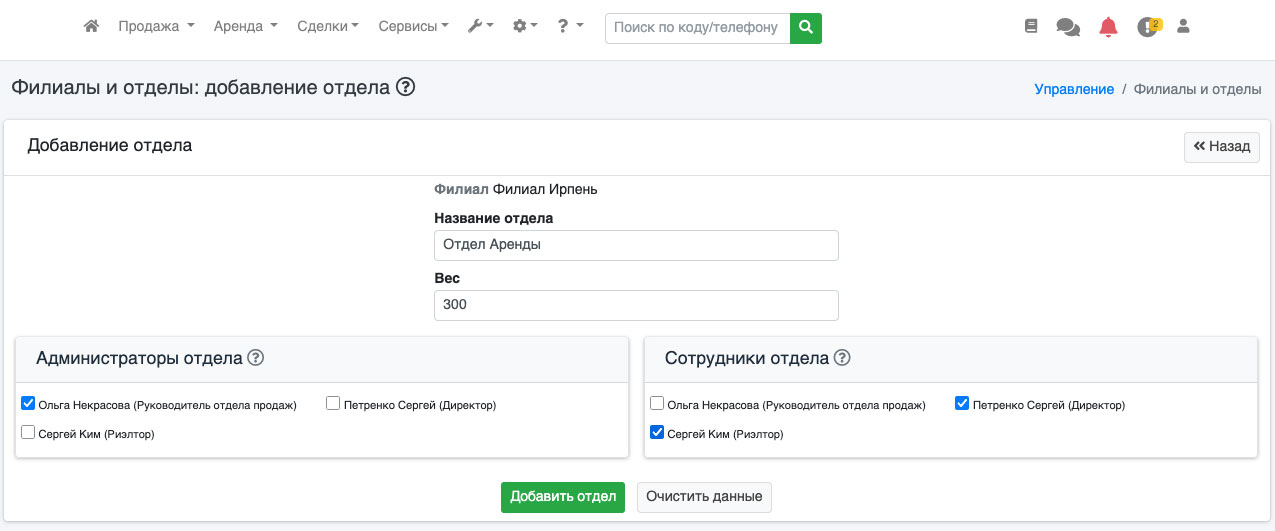 На сторінці, необхідно вказати назву відділу, якщо потрібно, то вагу (сортування) і вибрати керівника або кілька керівників відділу, а також співробітників філії зі списку. Після того як Ви все заповнили і обрали потрібних користувачів натисніть кнопку «Додати відділ» (Рис. 794).