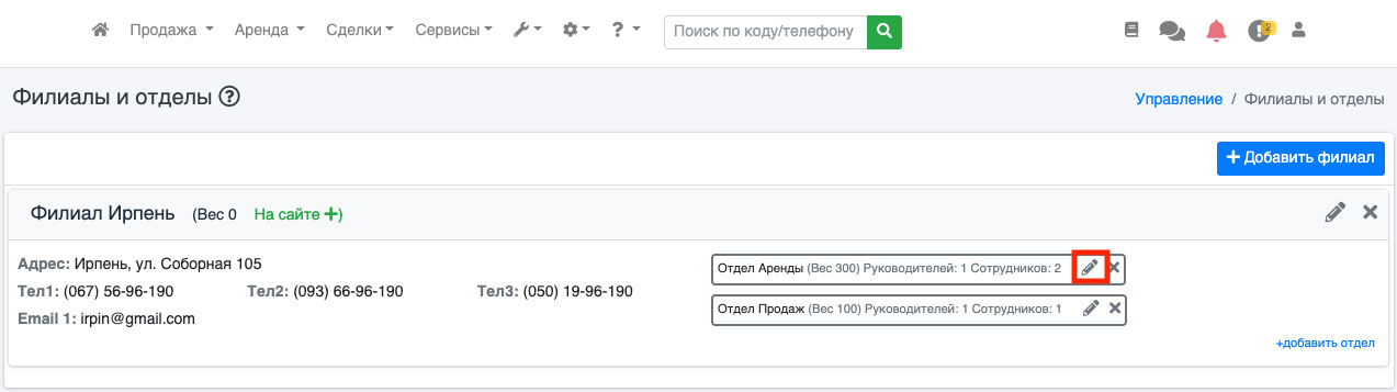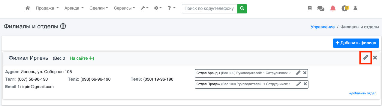 Щоб відредагувати потрібну філію просто натисніть на іконку «олівець» навпроти необхідної філії (Рис. 798).