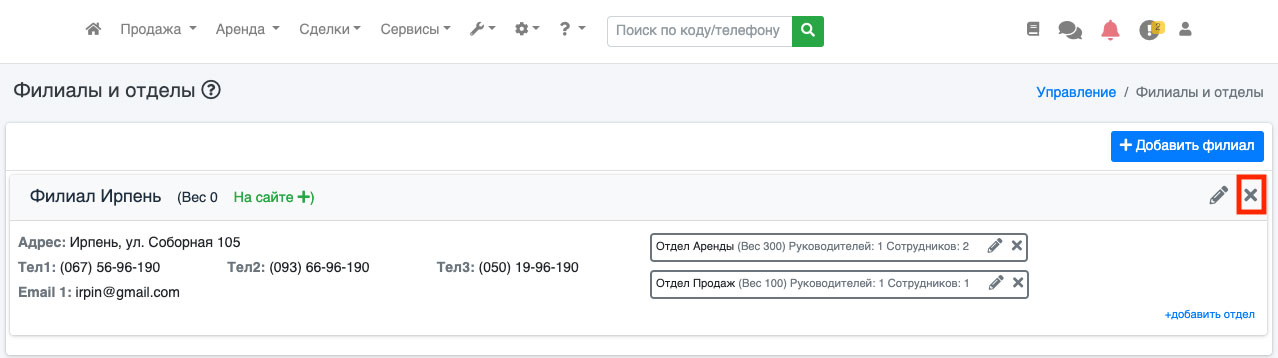 Щоб видалити непотрібну філію просто натисніть на іконку «хрестик» навпроти непотріюної філії (Рис. 799).