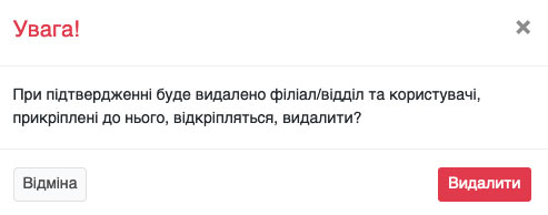 У Вас з'явиться діалогове вікно з проханням підтвердити видалення (Рис. 800). Щоб видалити філію натисніть кнопку «Підтвердити».