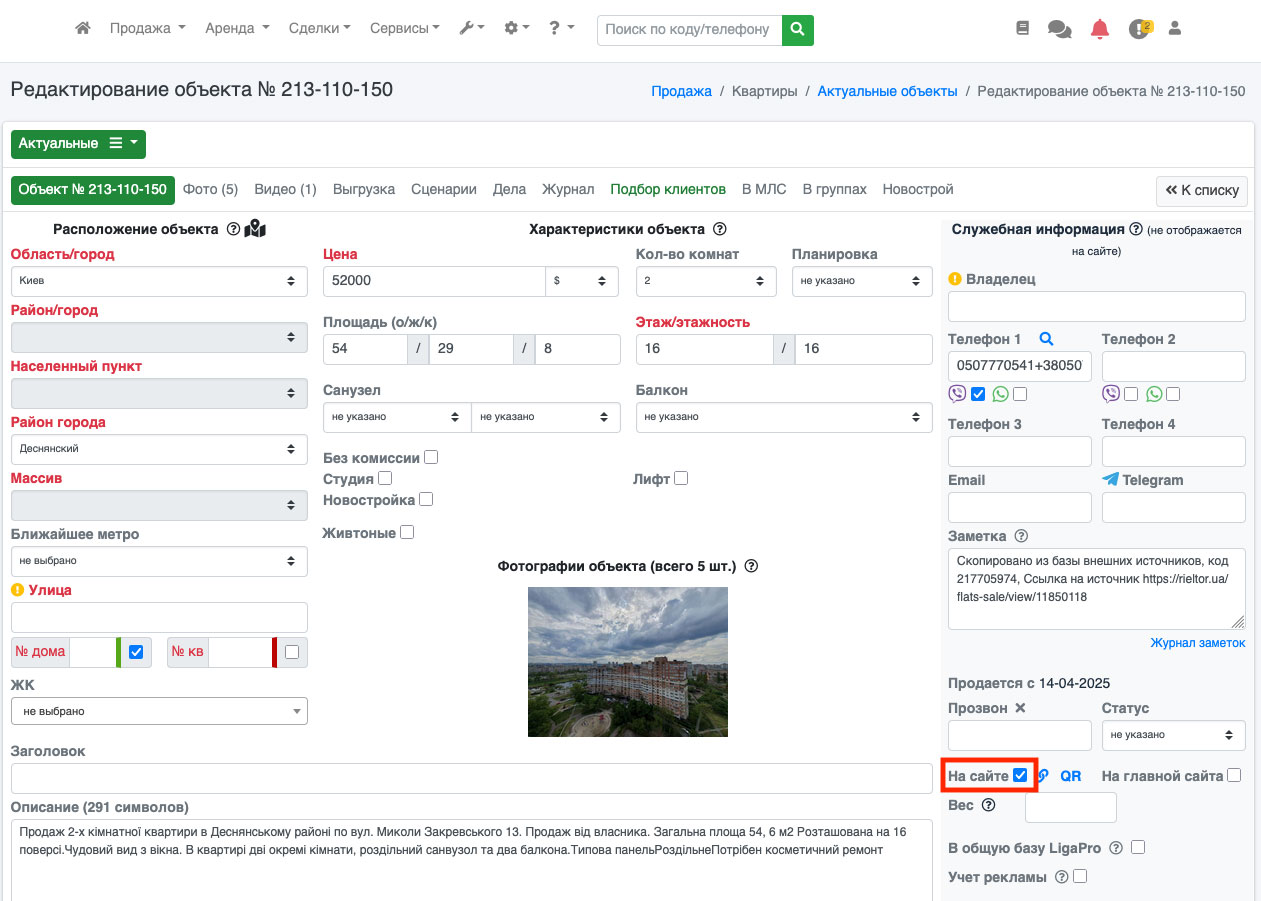 - Менеджер dom.pliz.info пришлет на Вашу почту условия выгрузки на портал. После согласования всех условий и стоимости, автоматическая выгрузка запустится и будет полностью настроена. Все что Вам необходимо это просто вносить объекты в ЛигаПро и обязательно указывать галочку «на сайте» (Рис. 869). И в течении суток объект будет опубликован на портале dom.pliz.info.