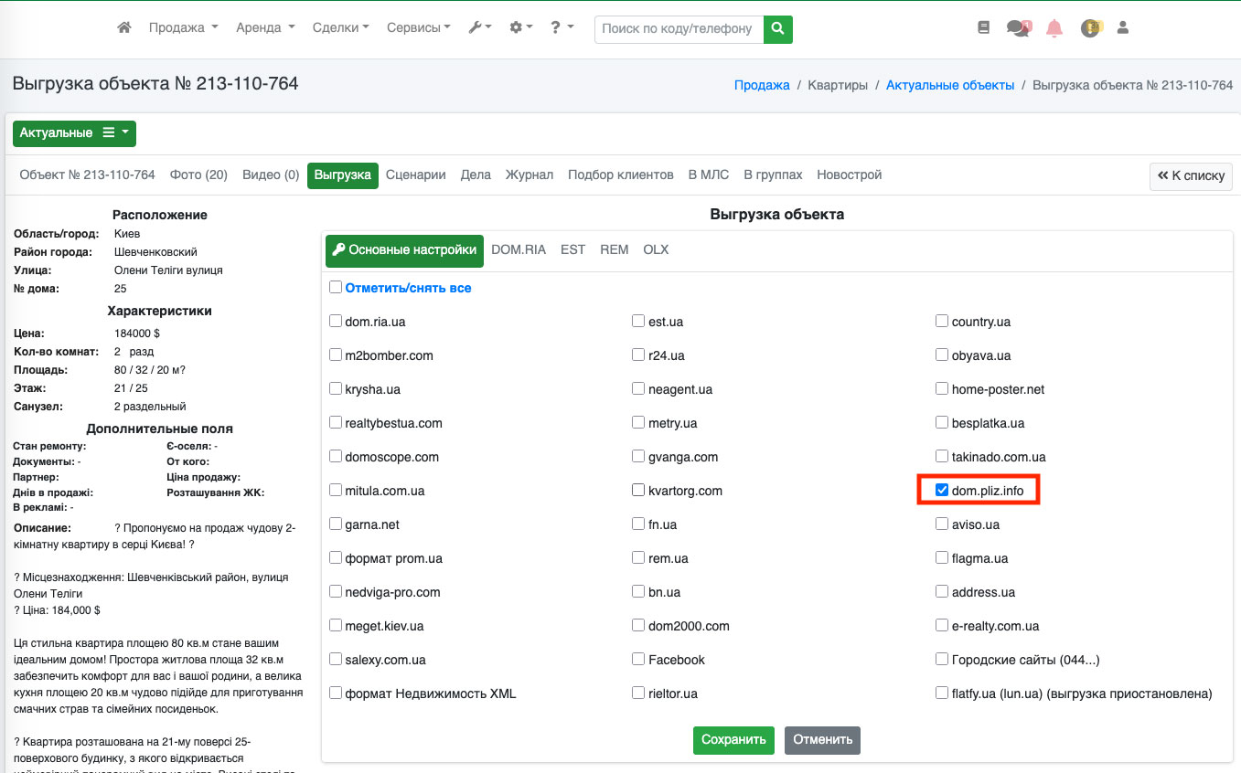 Если Вы отправили файл с выбранными объектами также необходимо в редактировании объекта на вкладке «Выгрузка XML» поставить галочку напротив портала dom.pliz.info и нажать кнопку сохранить, после этого объект попадает в файл с выбранными объектами и публикуется на dom.pliz.info (Рис. 870).