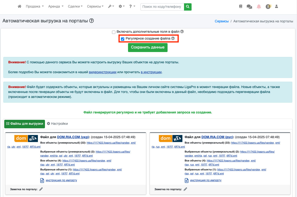 Если на открывшейся странице(Рис. 875). еще нет списка файлов, поставьте галочку «Регулярное создание файла» и нажмите кнопку «Сохранить настройки». В течении дня файлы будут сгенерированы.