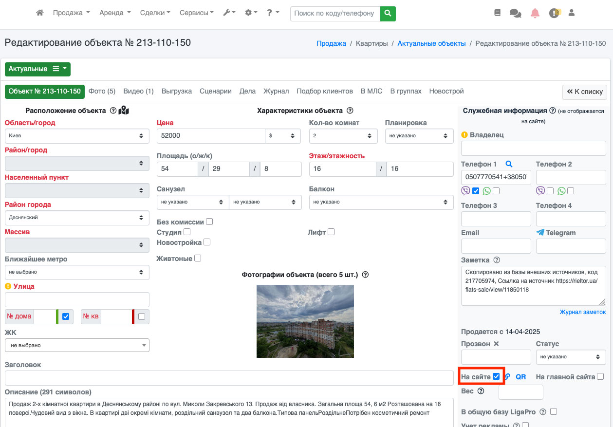 Все что Вам необходимо это просто вносить объекты в ЛигаПро и обязательно указывать галочку «на сайте» (Рис. 878). И в течении суток объект будет опубликован на портале krysha.ua.