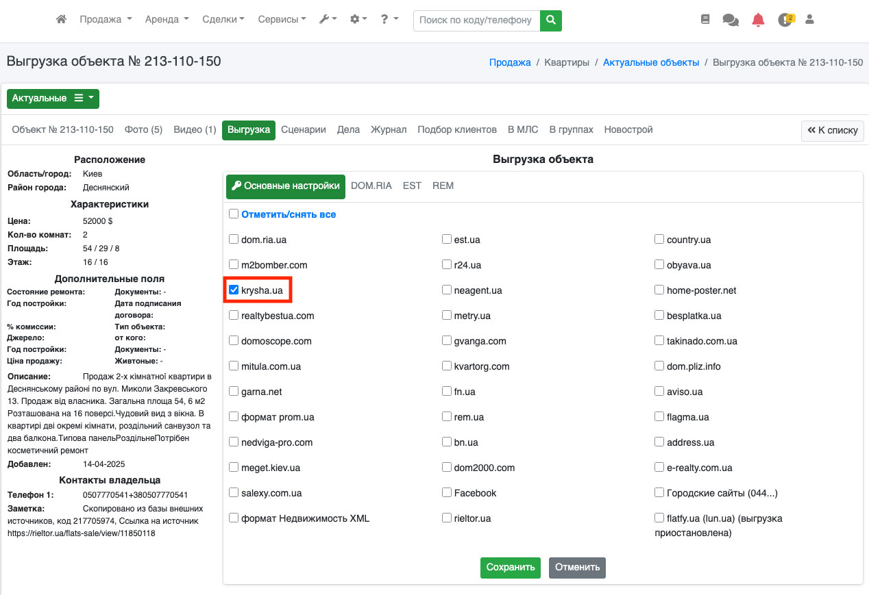 Если Вы отправили файл с выбранными объектами также необходимо в редактировании объекта на вкладке «Выгрузка XML» поставить галочку напротив портала krysha.ua и нажать кнопку сохранить, после этого объект попадает в файл с выбранными объектами и публикуется на krysha.ua (Рис. 879).