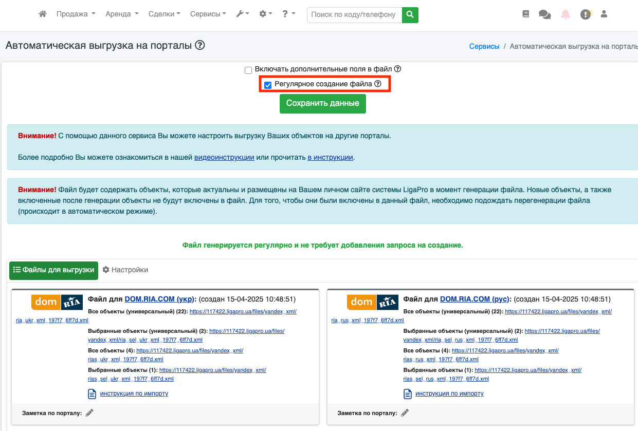 Если на открывшейся странице (Рис. 907) еще нет списка файлов, поставьте галочку «Регулярное создание файла» и нажмите кнопку «Сохранить настройки». В течении дня файлы будут сгенерированы.