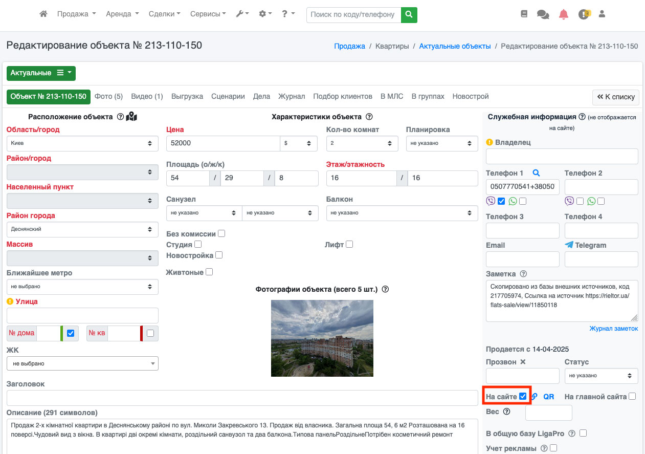 - Менеджер est.ua пришлет на Вашу почту условия выгрузки на портал. После согласования всех условий и стоимости, автоматическая выгрузка запустится и будет полностью настроена. Все что Вам необходимо это просто вносить объекты в ЛигаПро и обязательно указывать галочку «на сайте» (Рис. 909). И в течении суток объект будет опубликован на портале est.ua.
