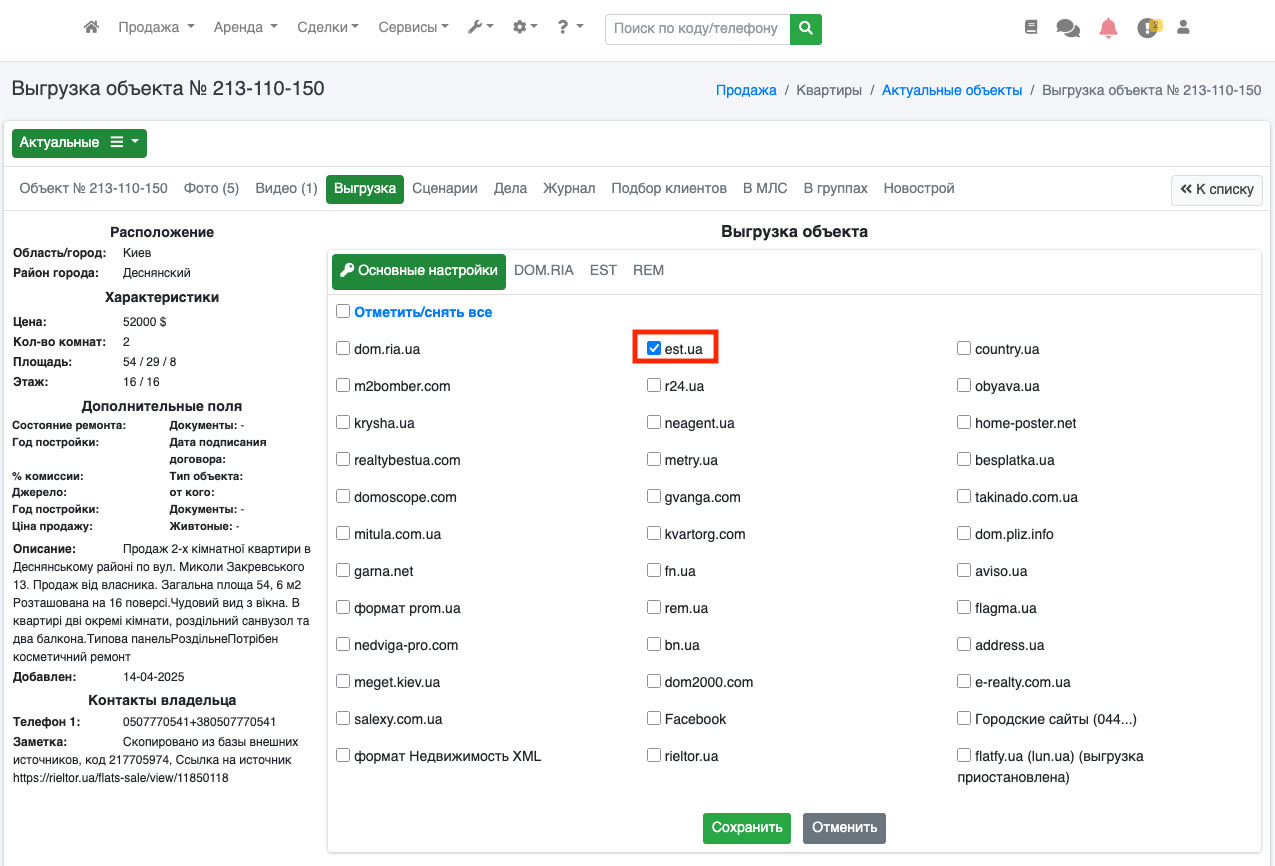 Если Вы отправили файл с выбранными объектами также необходимо в редактировании объекта на вкладке «Выгрузка XML» поставить галочку напротив портала est.ua и нажать кнопку сохранить, после этого объект попадает в файл с выбранными объектами и публикуется на est.ua (Рис. 910).