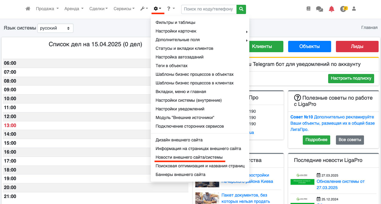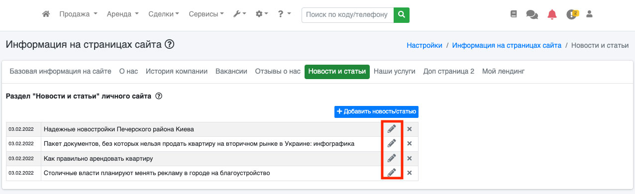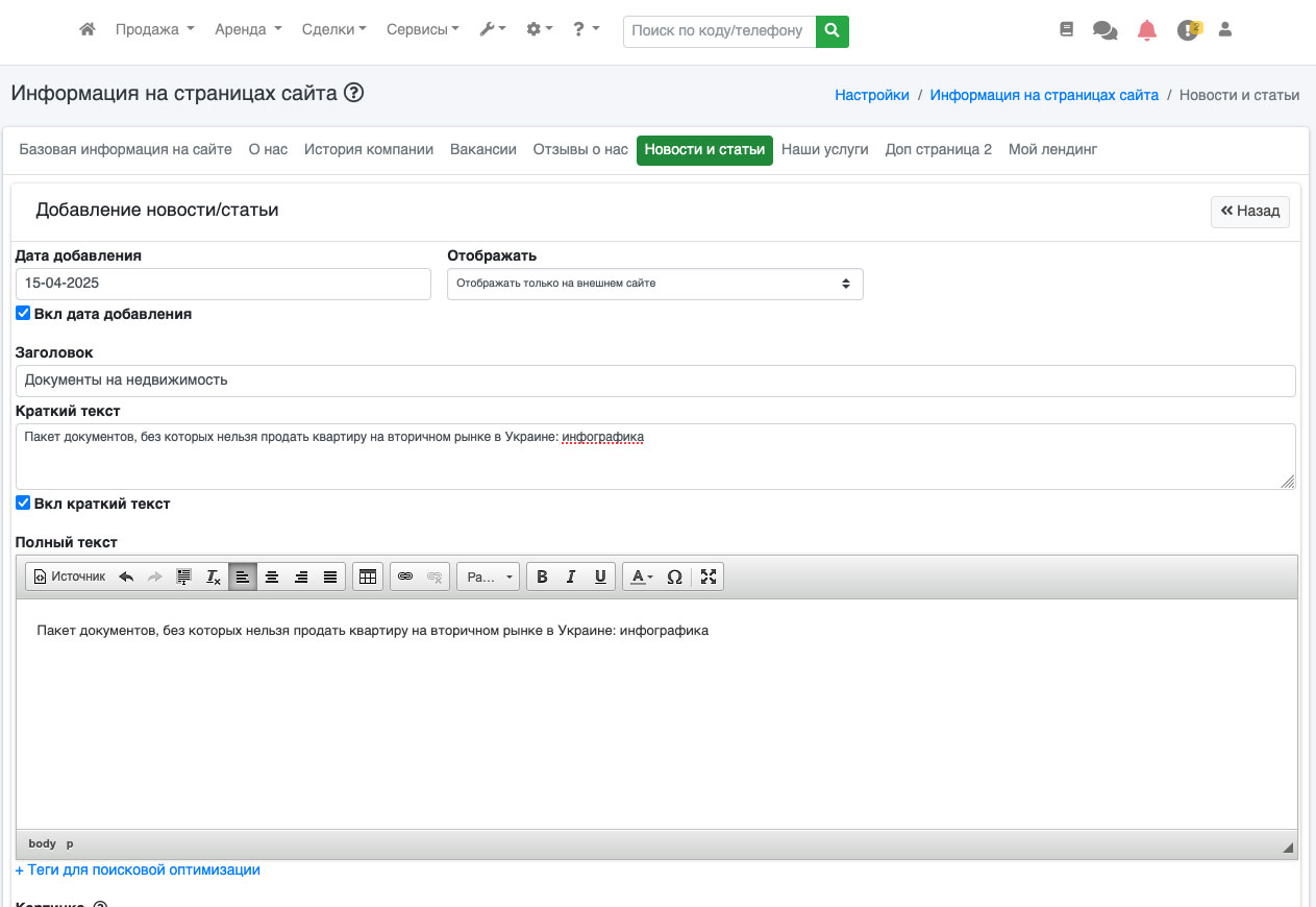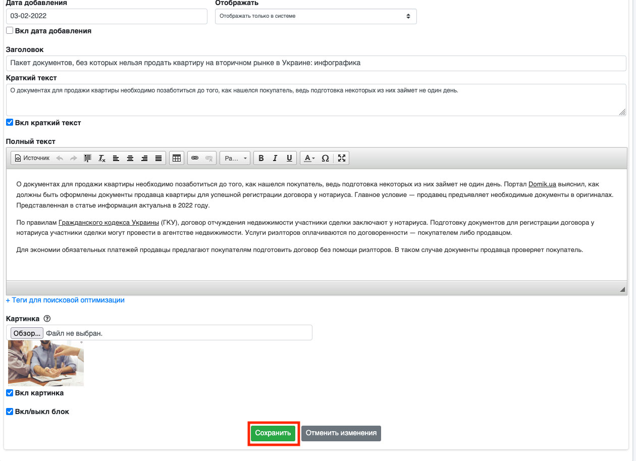 - Вкл/выкл – управление отображение новости. При необходимости Вы можете в любой момент включать или выключать Вашу новость/статью.