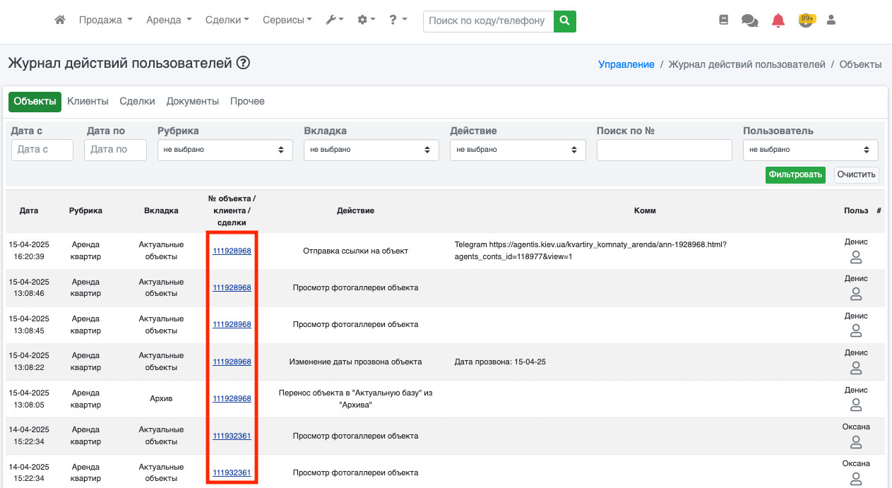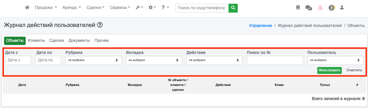На открывшейся странице на вкладке «Объекты» в фильтре, чтобы быстро найти нужный объект, Вы можете задать такие параметры как: дата удаления, рубрика, вкладка, код объекта и пользователь. (Рис. 1054).