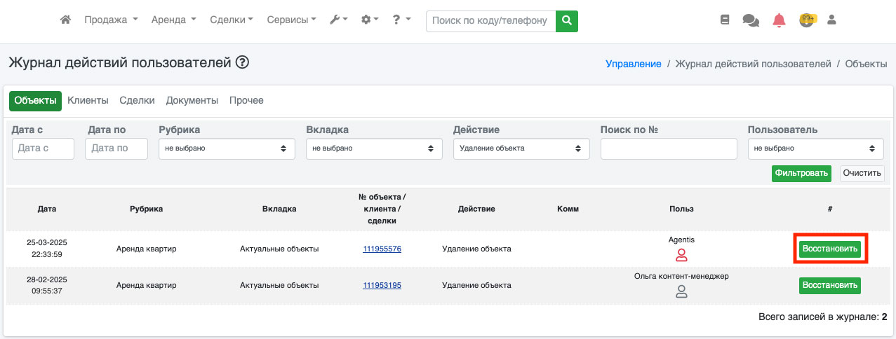 Чтобы восстановить объект перейдите в пункт «Управление – журнал действий пользователей» (Рис. 1053).