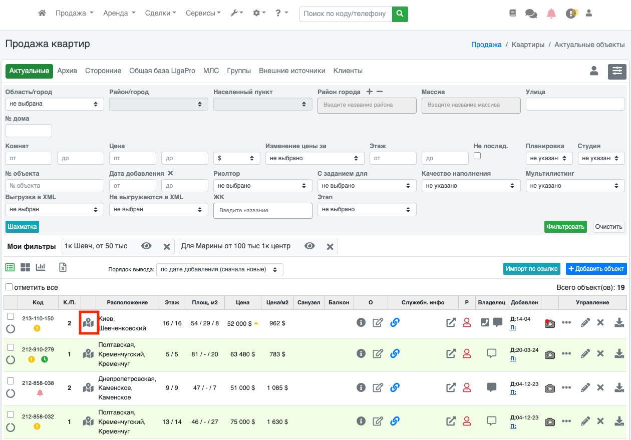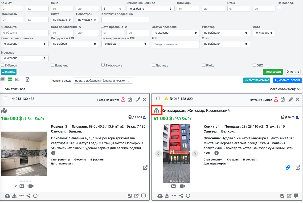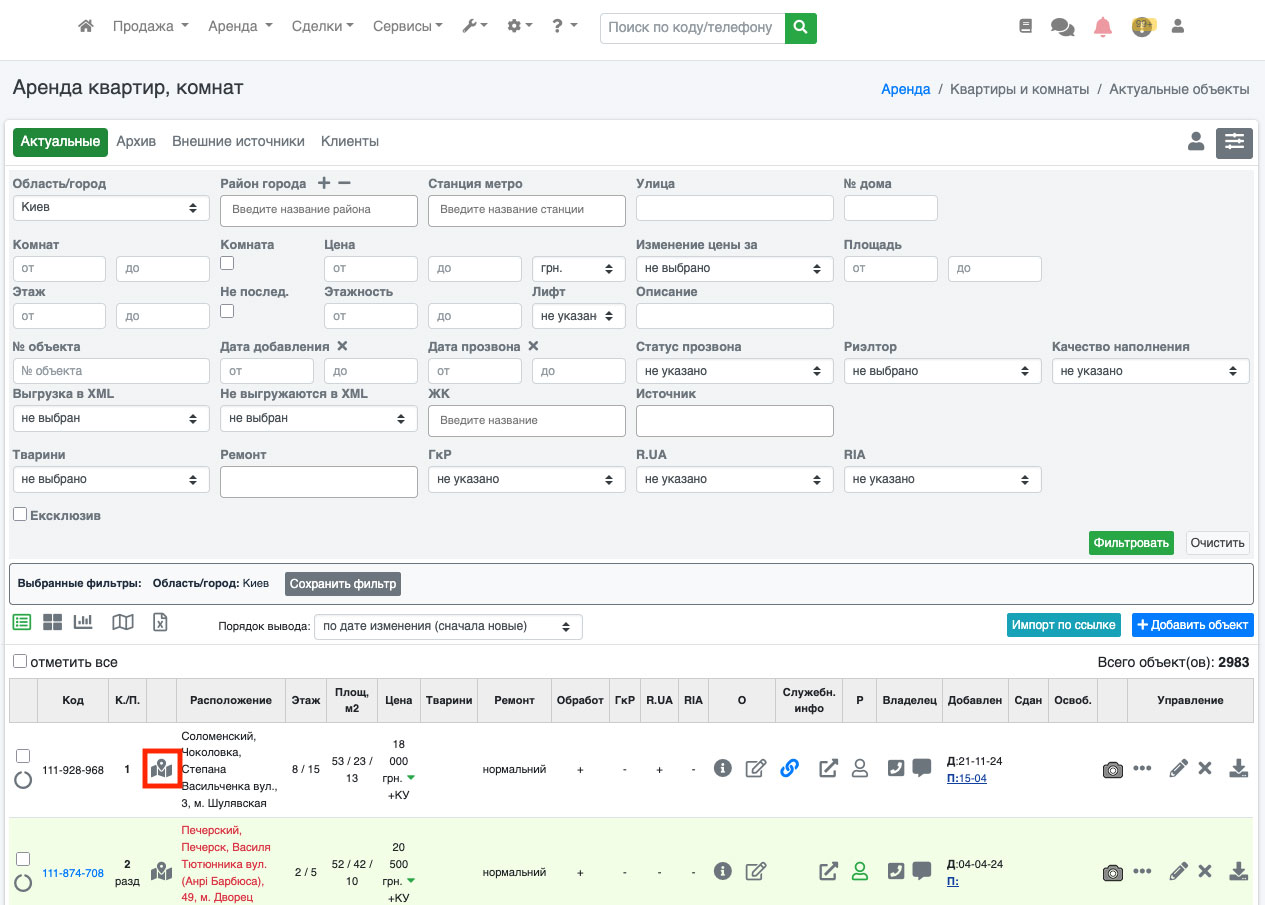 При добавлении объекта, основываясь на его местоположении система автоматически устанавливают метку на карте. В последующем это расположение указывается на Вашем внешнем сайте на странице объекта, внутри системы при отображении объекта на карте. Иногда в связи с неверным названием улицы, не указанием номера дома или другими параметрам система не верно определяет положение объекта на карте. Именно по этому существует возможность ручного указания местоположения объекта на карте. Для этого перейдите в нужную рубрику к списку объектов и найдите иконку «карты» и нажмите на нее (Рис. 1063, Рис. 1064).