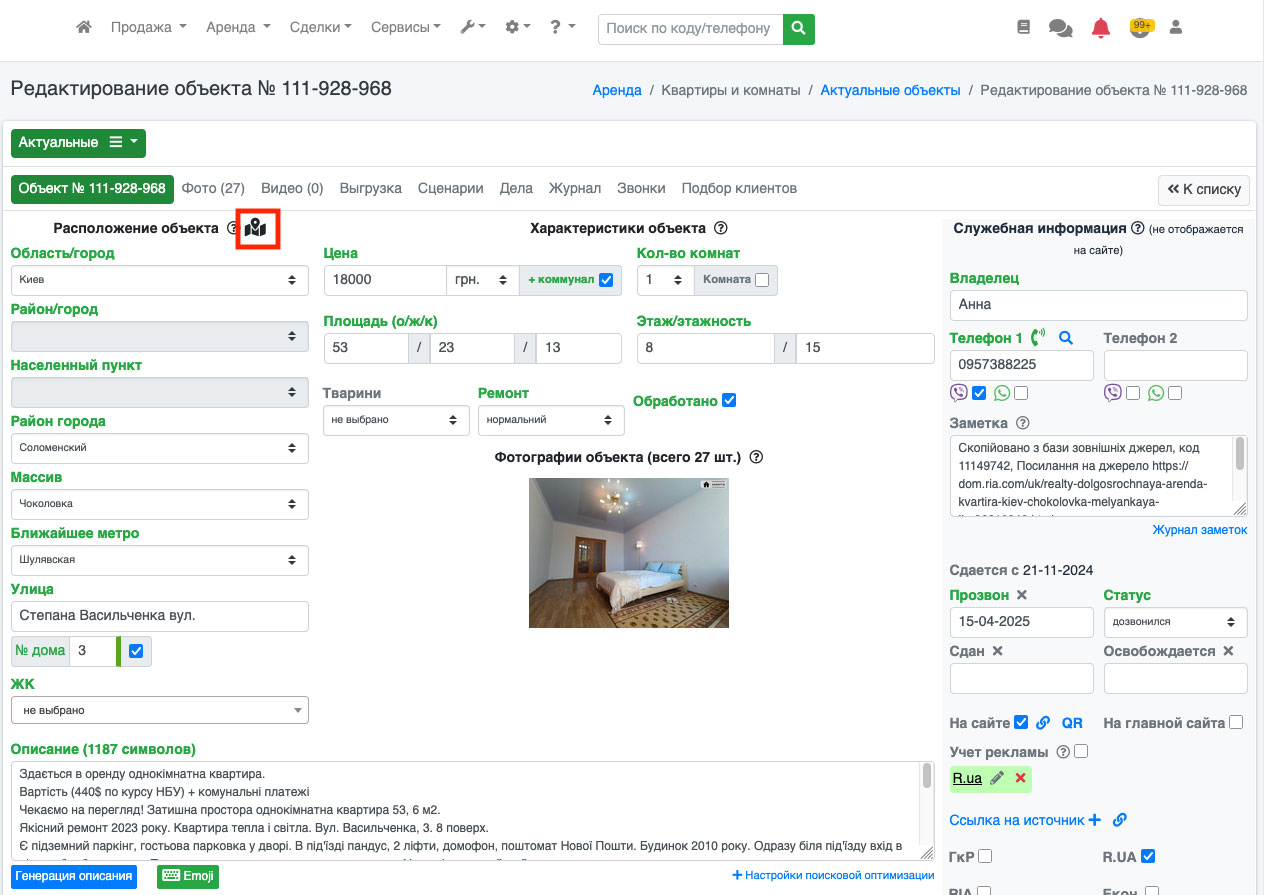 Чтобы посмотреть объект на карте со страницы редактирования, найдите возле блока расположения объекта иконку карты и нажмите на нее (Рис. 1061).