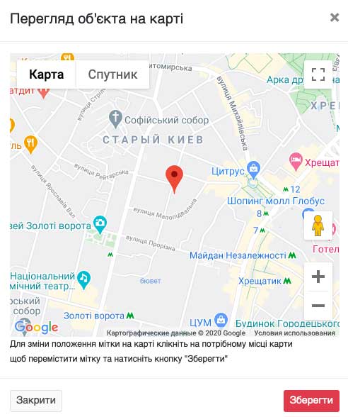 Нажав на иконку карты система отобразит диалоговое окно с отображением объекта на карте. Чтобы изменить местоположения объекта просто перетащиме на карте метку с местоположение в нужное место (Рис. 1065).