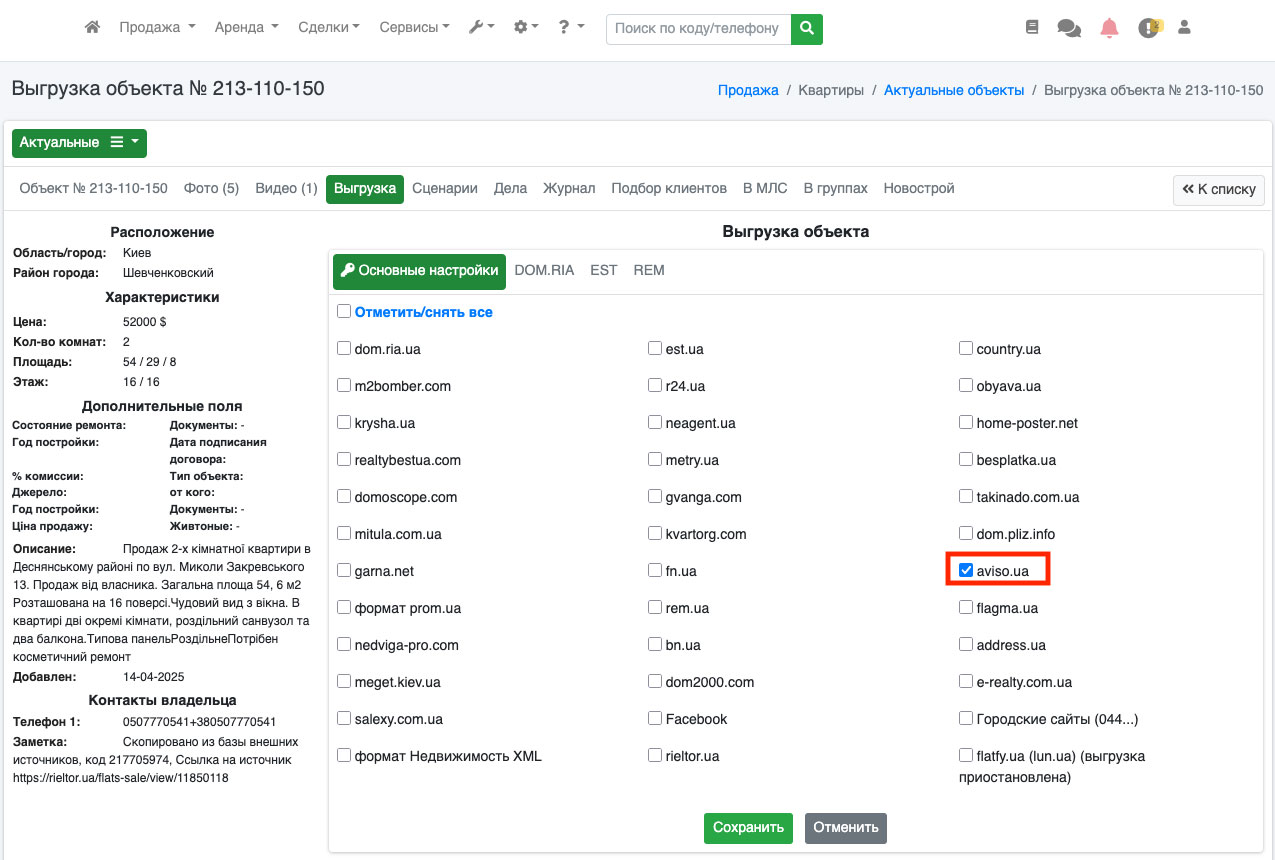 Якщо Ви відправили файл з обраними об'єктами також необхідно в редагуванні об'єкта на вкладці «Вигрузка XML» поставити галочку навпроти порталу aviso.ua і натиснути кнопку зберегти, після цього об'єкт потрапляє в файл з обраними об'єктами і публікується на aviso.ua (Рис. 1081).