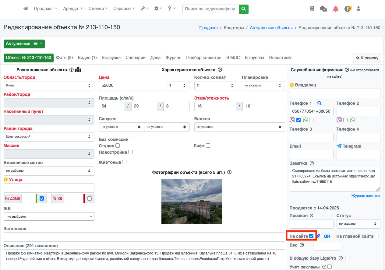 - Менеджер rem.ua надішле на Вашу пошту умови вигрузки на портал. Після узгодження всіх умов і вартості, автоматична вигрузка запуститься і буде повністю налаштована. Все що Вам необхідно це просто вносити об'єкти в ЛігаПро і обов'язково вказувати галочку «на сайті» (Рис. 1086). І протягом доби об'єкт буде опублікований на порталі rem.ua.