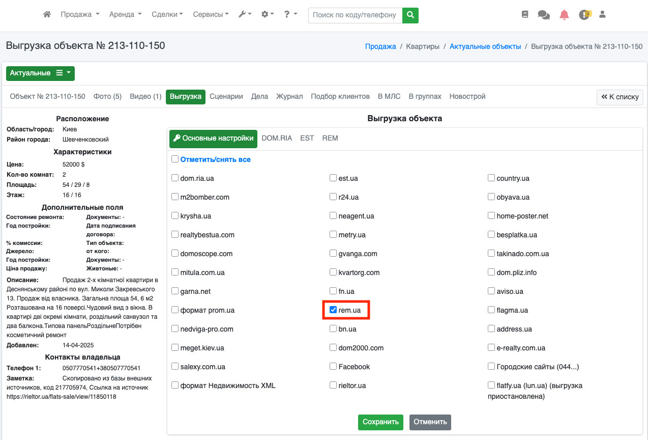Якщо Ви відправили файл з вибраними об'єктами також необхідно в редагуванні об'єкта на вкладці «Вигрузка XML» поставити галочку навпроти порталу rem.ua і натиснути кнопку зберегти, після цього об'єкт потрапляє в файл з вибраними об'єктами і публікується на rem.ua (Рис. 1087).