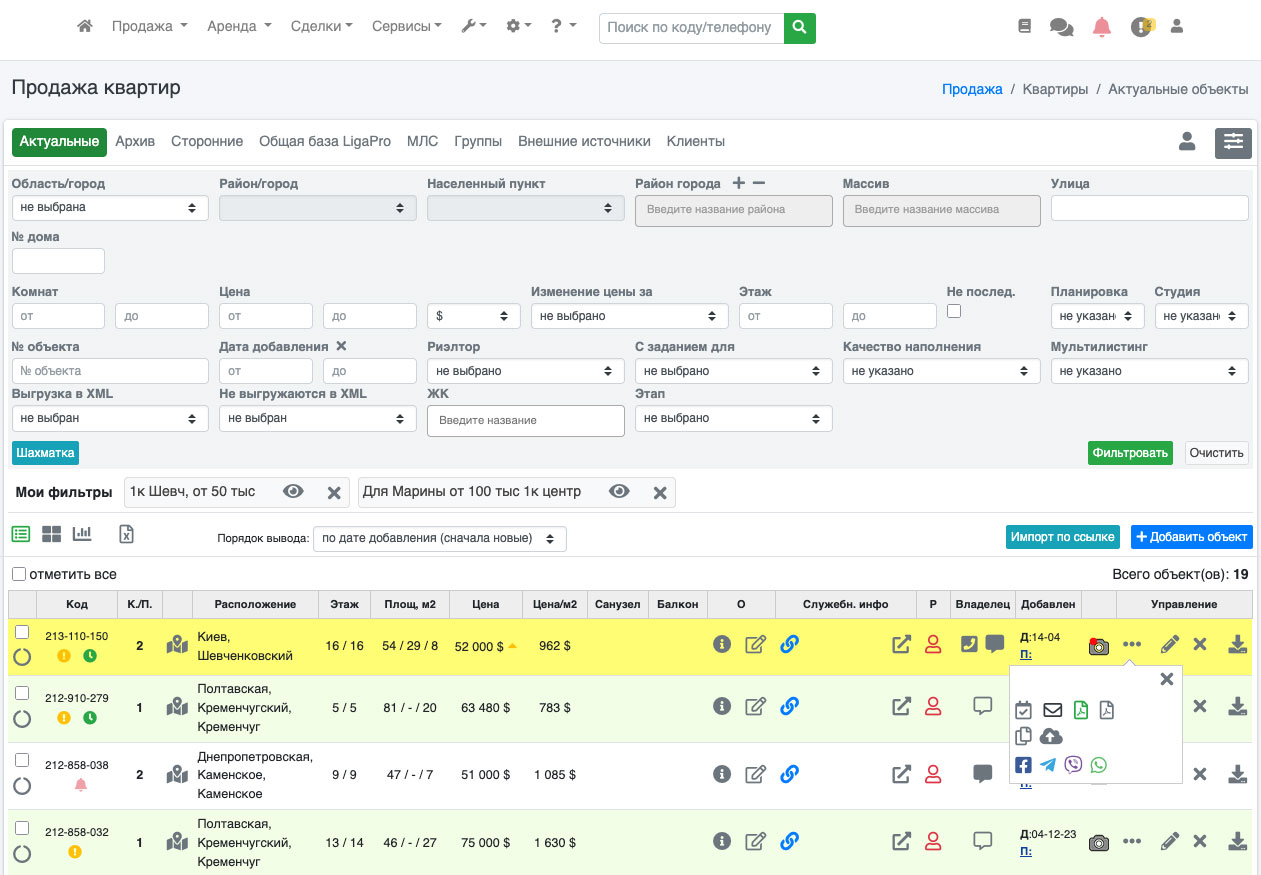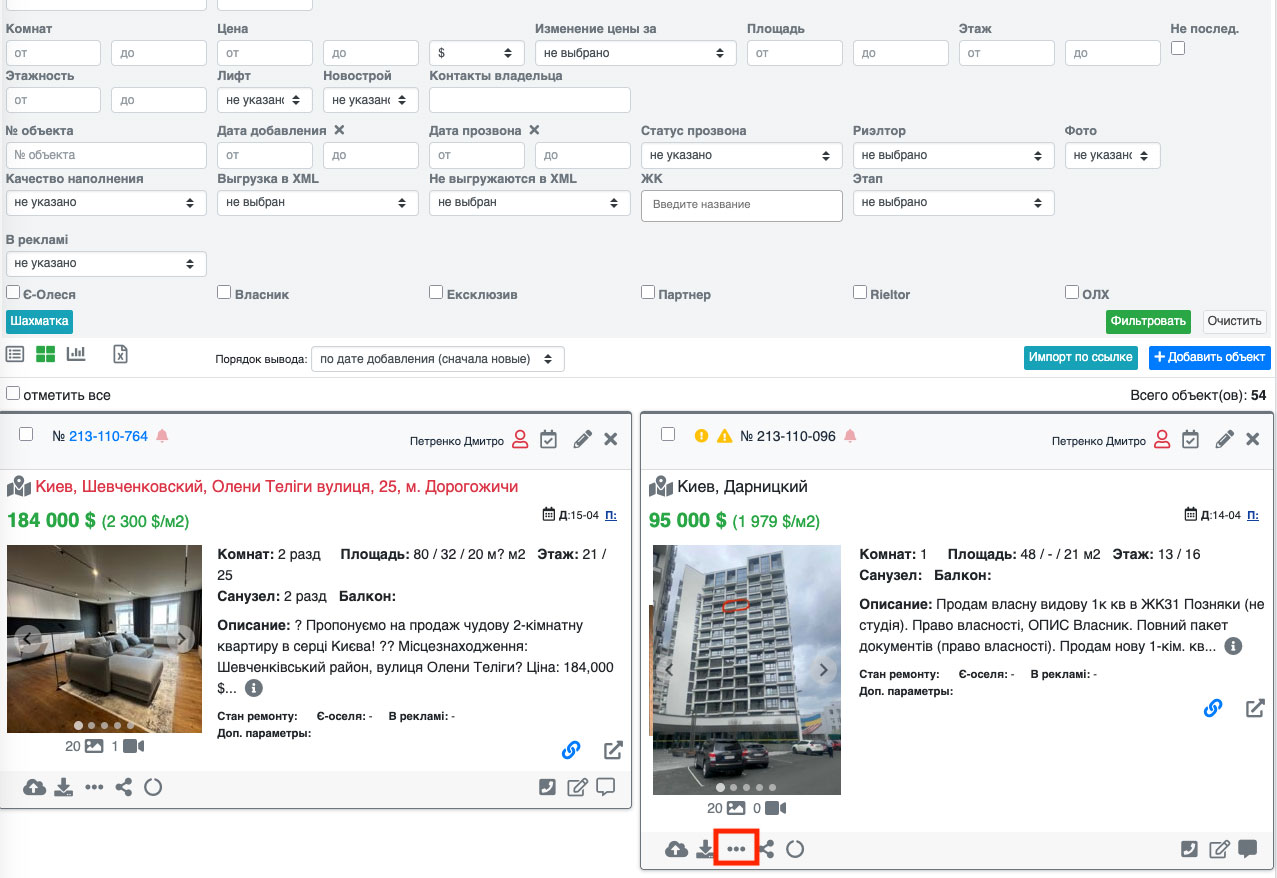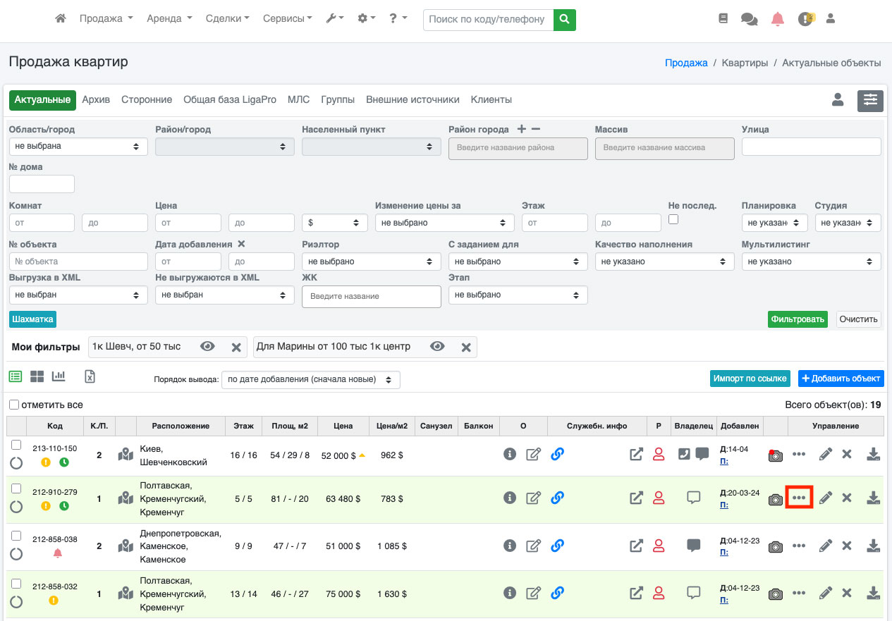 Для цього перейдіть до списку об’єктів і навпроти потрібного об’єкта знайдіть іконку «Три крапки» (Рис. 1103) при перегляді списком або іконку «Поділитися» при перегляді блоками (Рис. 1104).