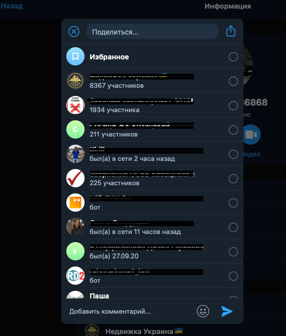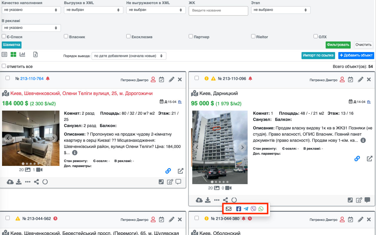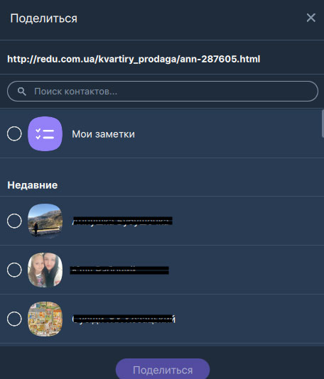 Після натискання на кружечок у Вас відкриється додаткове меню, де Ви можете обрати в якому месенджері поділитися об'єктом (Рис. 1105, Рис. 1106).