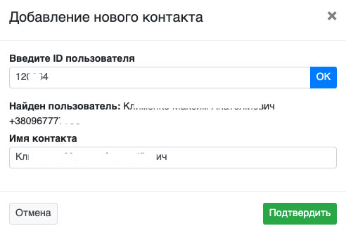 У вікно, що відкрилося (Рис. 85), Ви вводите id користувача і натискаєте ок, якщо такий користувач існує, система видасть Вам його ім'я, запропонує можливість підписати його так як Вам зручно, виконавши всі дії після натискання клавіші «ОК» користувача буде додано в список «Мої контакти» (Рис. 86).