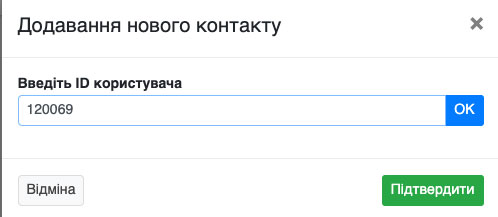 У вікно, що відкрилося (Рис. 85), Ви вводите id користувача і натискаєте ок, якщо такий користувач існує, система видасть Вам його ім'я, запропонує можливість підписати його так як Вам зручно, виконавши всі дії після натискання клавіші «ОК» користувача буде додано в список «Мої контакти» (Рис. 86).