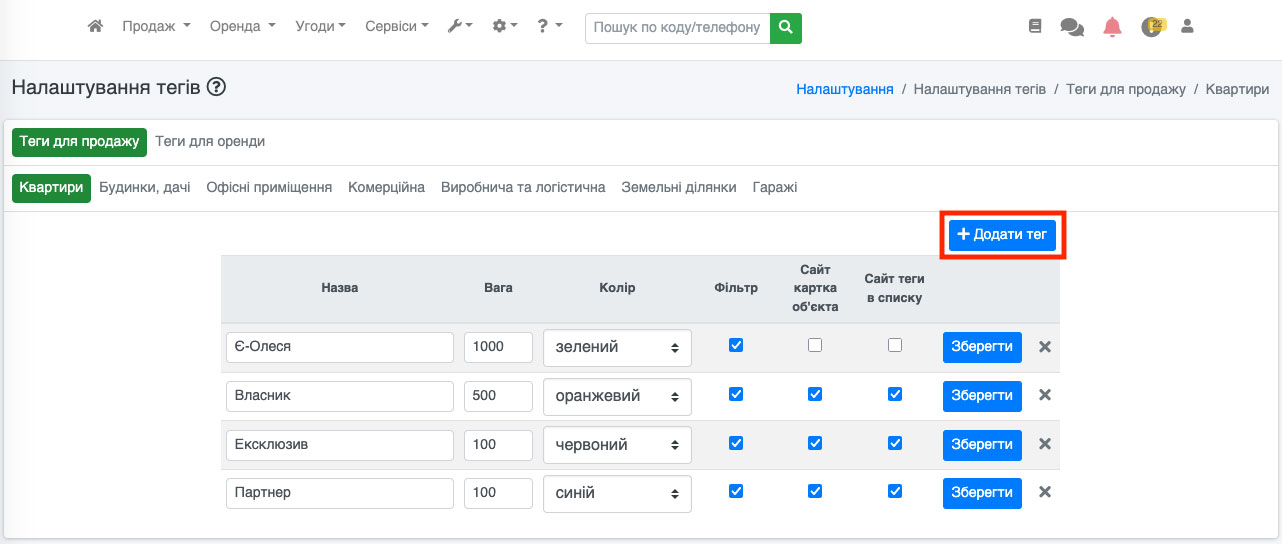 На сторінці, потрібно вибрати вкладку «теги для продажу» або «теги для оренди' (в нашому випадку потрібна оренда) і вибрати категорію нерухомості (в нашому випадку «Квартири»). Після цього, щоб додати тег - натискаємо кнопку «Додати тег» (Рис. 1141).