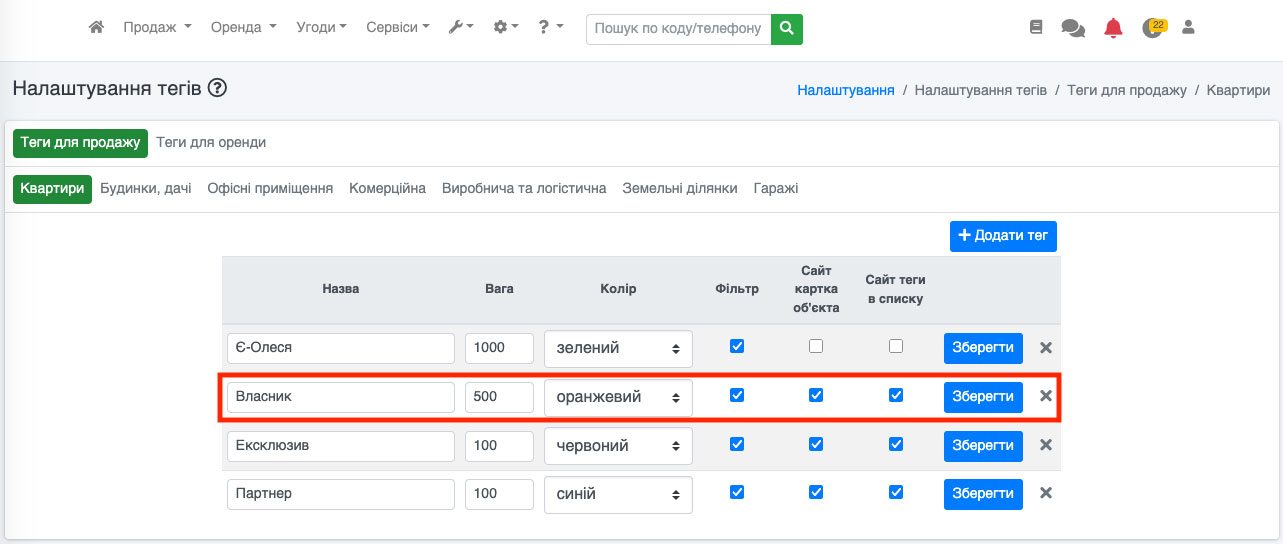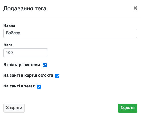 У Вас відкриється форма додавання (Рис. 1142). Ви можете вказати назву тега, його вагу і, при необхідності, встановити галочку «У фільтрі системи» (щоб можна було відфільтрувати об’єкти за цим тегом в CRM), галочку «На сайті в картці об'єкта» (якщо потрібно, щоб цей тег виводився і в картці об'єкта на Вашому персональному сайті), галочку «на сайті в хмарі тегів» (якщо Ви налаштовуєте хмару тегів див. «Створення хмари тегів на зовнішньому сайті»). Також Ви можете обрати колір для тегу (цей колір буде підсвічувати тег як у самій CRM, так і на персональному сайті). Після того, як Ви вказали необхідні дані, необхідно натиснути на кнопку «Додати».