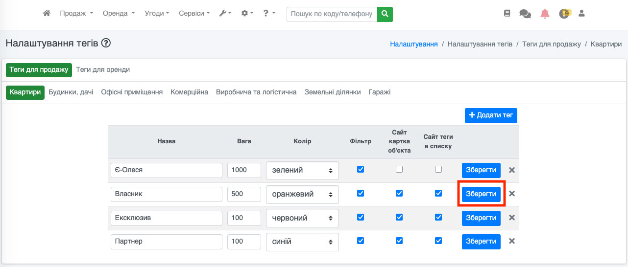Для того, щоб відредагувати тег, просто знайдіть його в списку, відредагуйте потрібну інформацію і навпроти нього натисніть кнопку «Зберегти» (Рис. 1144).