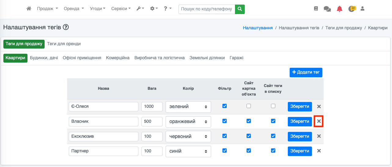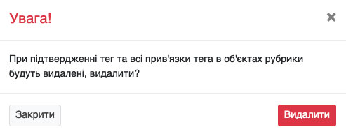 Якщо Ви хочете видалити тег - просто навпроти нього натисніть на червоний хрестик (Рис. 1145). У Вас з'явиться діалогове вікно підтвердження, в якому необхідно натиснути на кнопку «Видалити» (Рис. 1146).