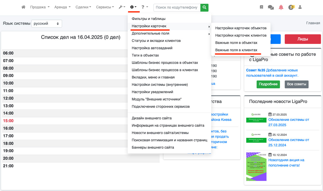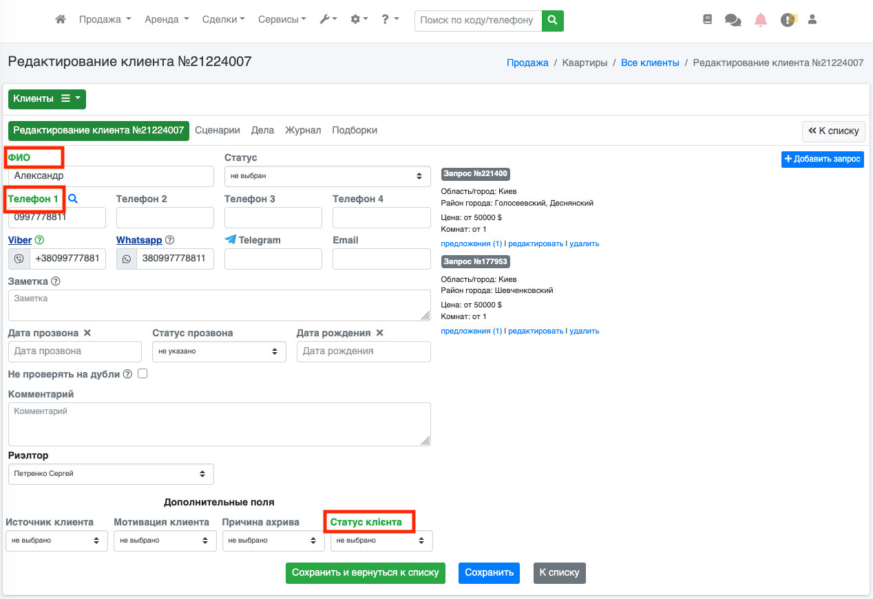 Тепер Ви можете зайти в потрібну рубрику і натиснути на кнопку «додати клієнта» (або натиснути на кнопку редагування вже будь-якого існуючого клієнта). Ви побачите, що на сторінці додавання / редагування поля, які ви зазначили, будуть відображатися кольором, який Ви обрали, щоб ріелтор відразу звернув увагу на ці поля (Рис. 1179). Додатково, при наведенні на назву поля, буде спливати підказка «Важливий для уточнення пункт». Таким чином, використовуючи систему важливих полів, Ваші користувачі будуть більш якісно заповнювати картку клієнта, що дозволить поліпшити ведення бази і скоротити час на уточнення потрібної інформації по конкретному клієнту.