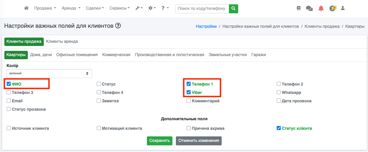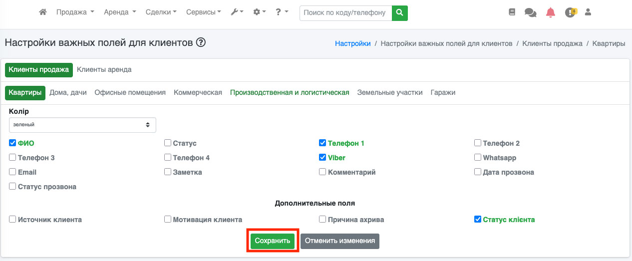 На сторінці, виберіть потрібну вкладку (продаж або оренда), після цього виберіть потрібну категорію: квартири, будинки, інше. Після цього біля тих полів, які Ви вважаєте важливими, поставте галочку і натисніть на кнопку «Зберегти» (Рис. 1177). Додатково Ви можете вибрати колір важливих полів.