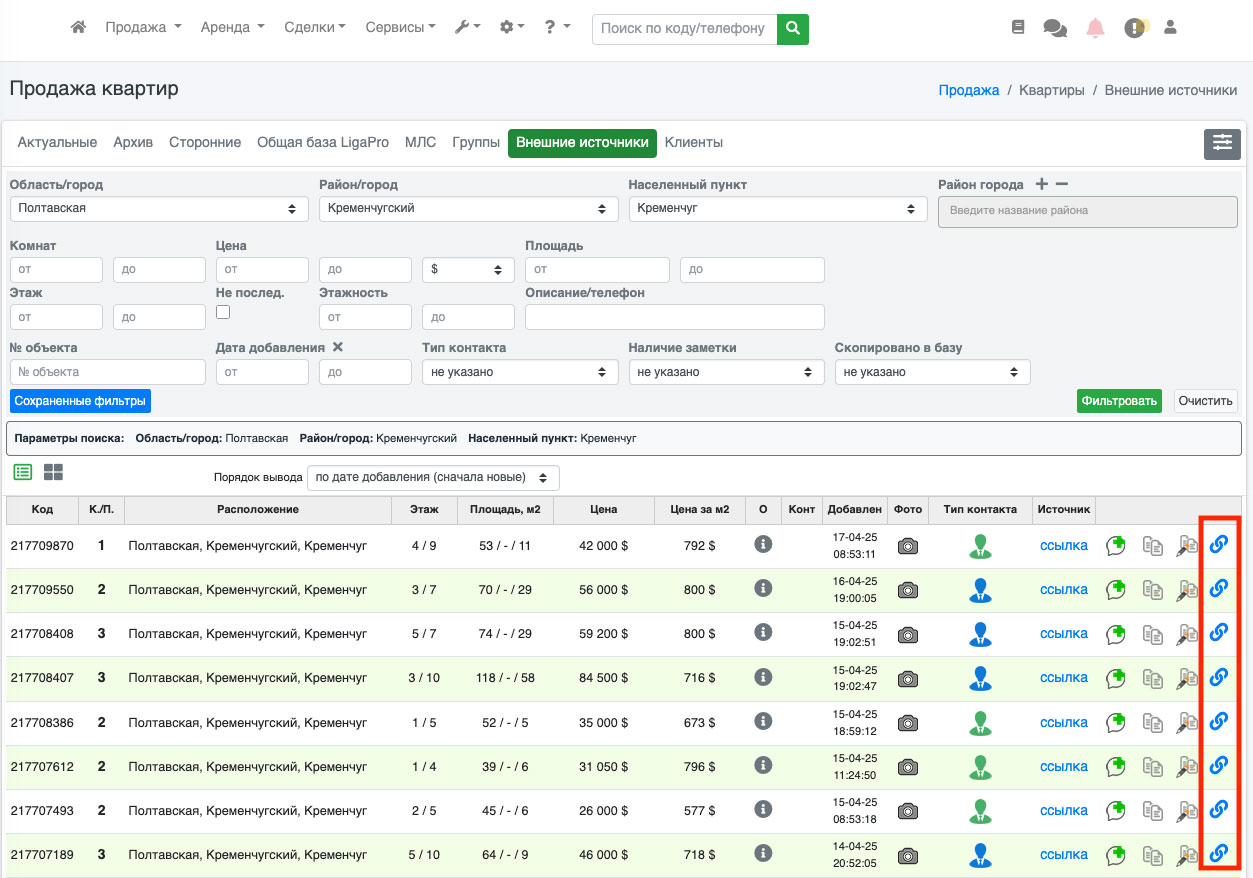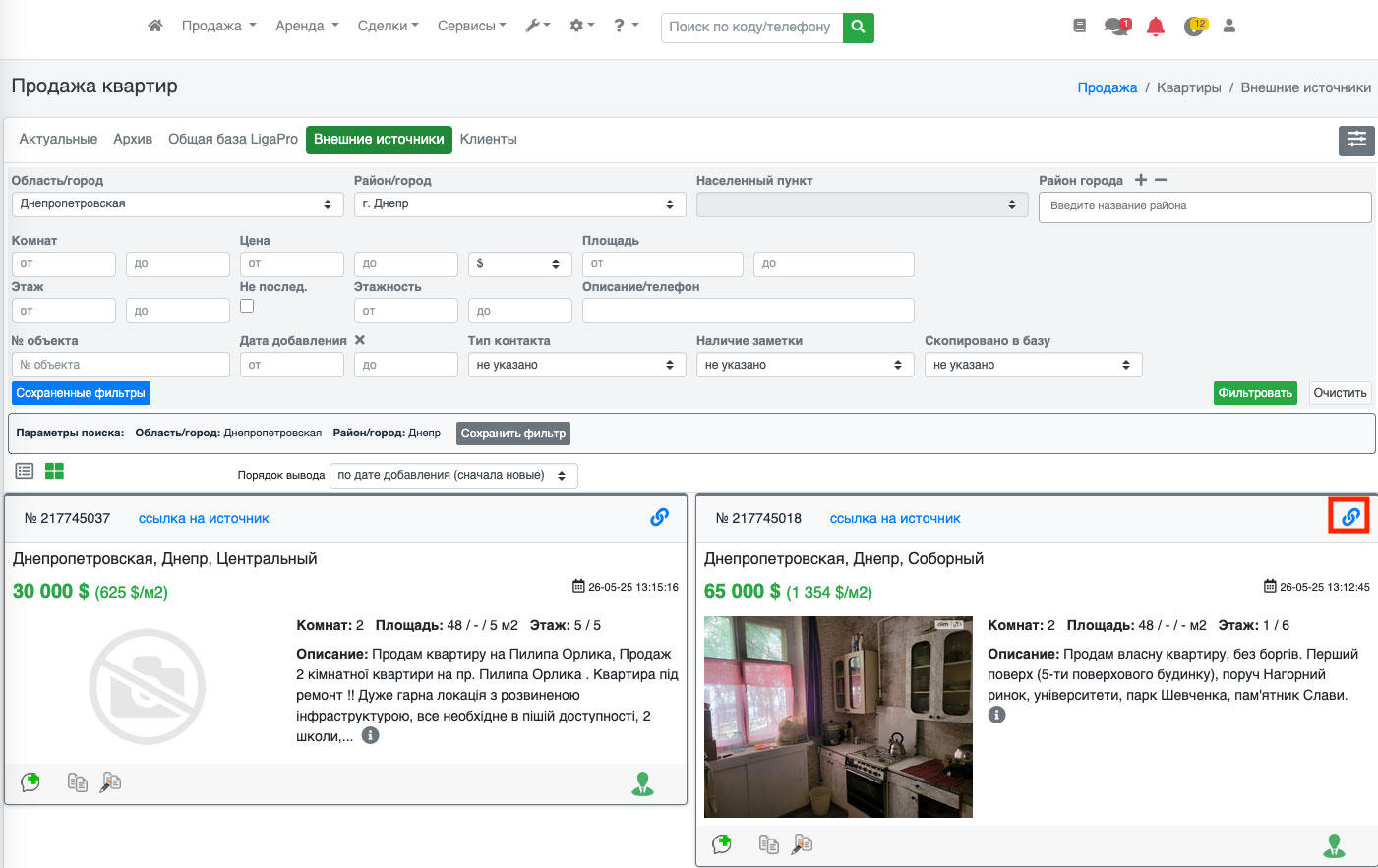 Ну, и конечно, для Вашего удобства сразу существует ссылка для отправки клиенту в удобный для него мессенджер. Чтобы создать быструю ссылку: перейдите во внешние источники, найдите нужный вам объект, найдите иконку «цепочки» и нажмите на нее (Рис. 1195).