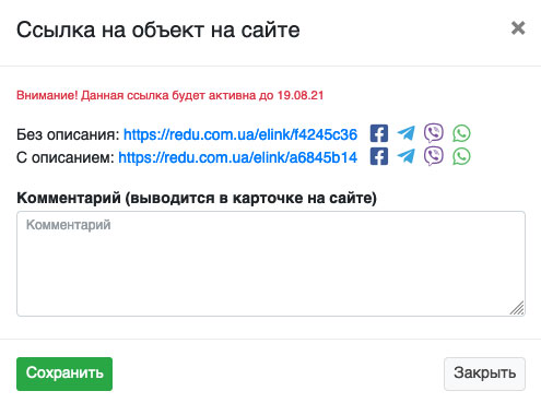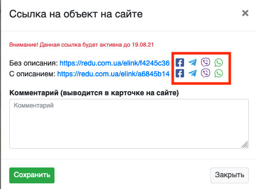 У Вас откроется диалоговое окно, где будет сформировано две ссылки (Рис. 1194). Одна ссылка на объект без описания, вторая на объект с описанием. Это сделано для тех случаев, когда, например, в объекте в описании на другом сайте может быть указан телефон другого риэлтора, приставка «хозяин» или любая другая информация, которую Ваш клиент не должен видеть - в таких случаях отправлять ссылку с описанием нельзя и тогда Вы можете использовать ссылку без описания, где будут только 5 фото объекта и базовые характеристики (количество комнат, метраж, этаж). Также существует такой параметр как «Комментарий», который позволяет Вам дополнительно написать информацию для Вашего клиента (например, дать какое-то пояснение или детали по объекту) - это особенно важно, если Вы не можете использовать описание, которое есть в объекте.