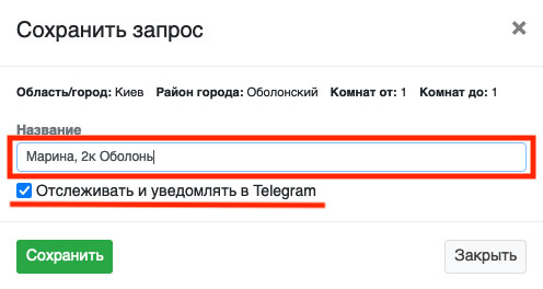 У Вас высветится диалоговое окно (Рис. 1198). В этом окне для удобства можно указать название фильтра (например «Марина, 2к Оболонь» и в телеграм будет приходить уведомление о появлении нового объекта по запросу «Имя запроса» и таким образом Вы сразу сможете понять, по какому запросу был подобран объект). Ну, и конечно, будет стоять галочка «Отслеживать и уведомлять в Telegram» (чтобы система Вас оповещала о новых объектах по этому запросу) и если Вы снимете эту галочку, то система не будет Вас уведомлять о новых объектах, но фильтр будет сохранен.