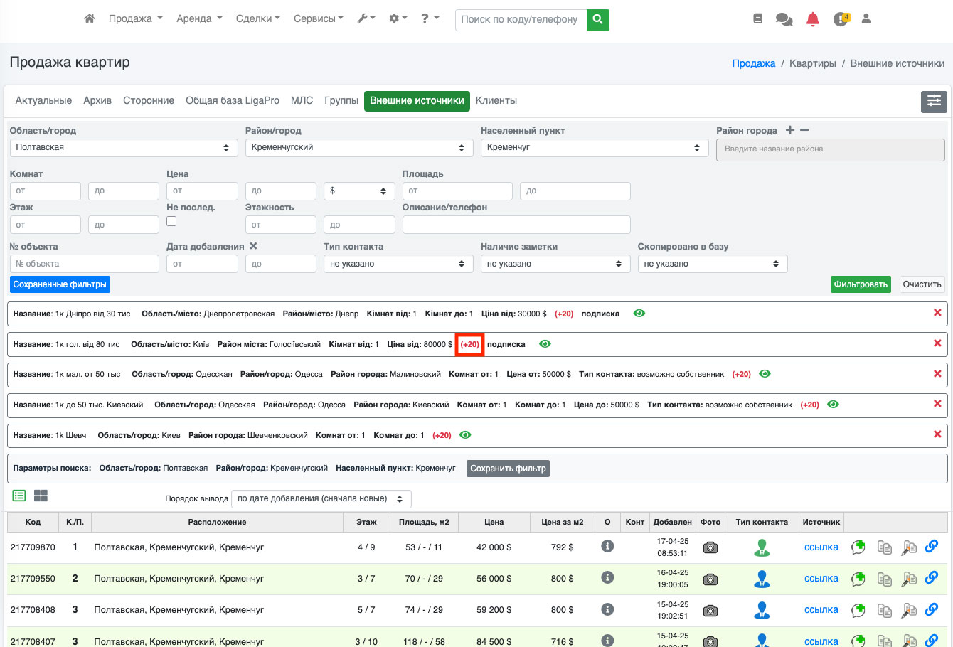 Также для Вашего удобства система ЛигаПро сразу высвечивает сколько новых объектов появилось по Вашему запросу после последнего Вашего просмотра (если их больше 20, то будет стоять цифра «+20», что означает «появилось больше 20 новых объектов, которые Вы еще не просматривали») (Рис. 1204).