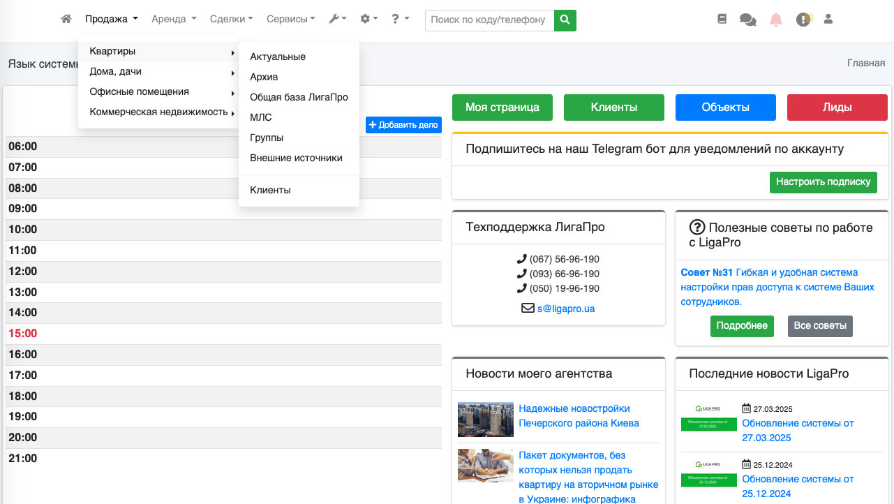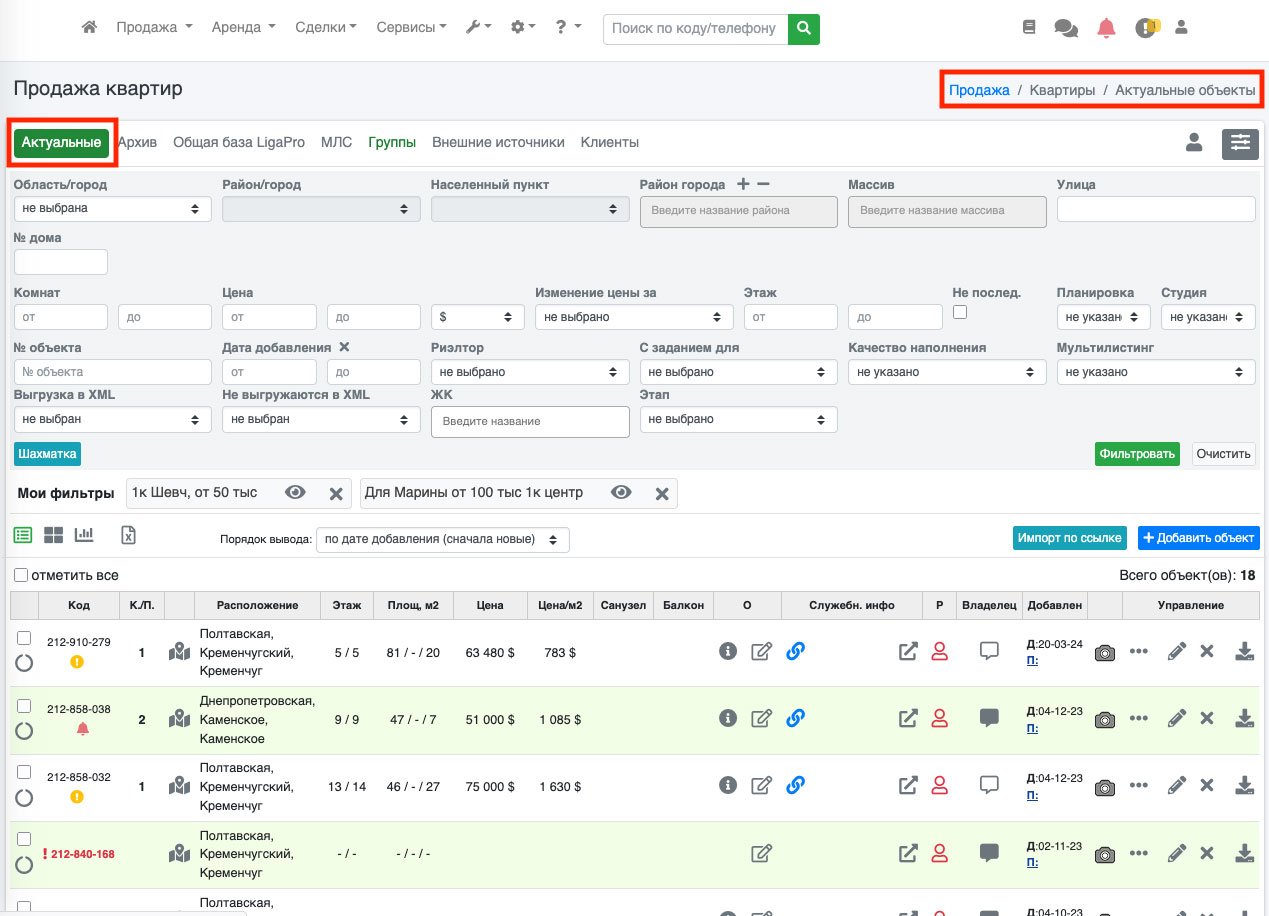МЛС ЛигаПро – в этой вкладке находятся объекты, которые публикуются в встроеную в ЛигаПро мультилистинговую систему см. МЛС ЛигаПро).