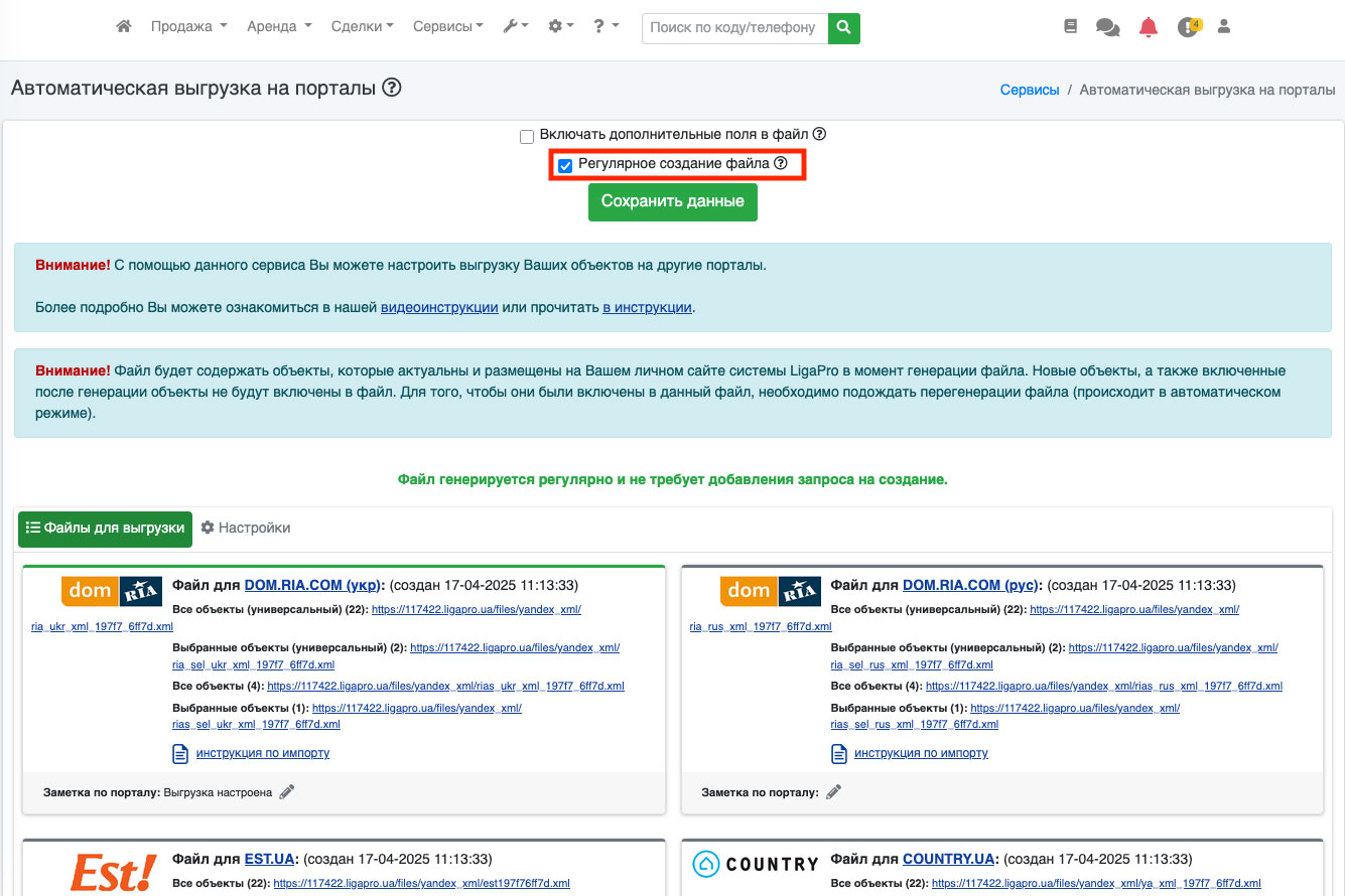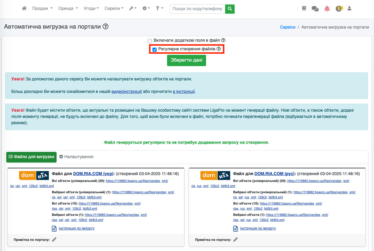 Якщо на відкрившийся сторінці (Рис. 1203) ще немає списку файлів - поставте галочку «Регулярне створення файлу» і натисніть кнопку «Зберегти налаштування». Протягом дня файли будуть згенеровані.
