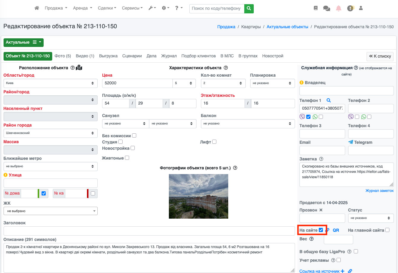 - Менеджер bn.ua надішле на Вашу пошту умови вивантаження на портал. Після узгодження всіх умов і вартості автоматичне вивантаження запуститься і буде повністю налаштовано. Все, що Вам необхідно - це просто вносити об'єкти в ЛігаПро, обов'язково вказувати галочку «на сайті» (Рис. 1205) і протягом доби об'єкт буде опублікований на порталі bn.ua.