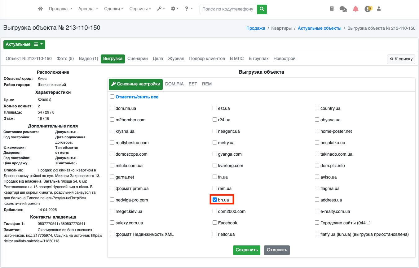 Якщо Ви відправили файл з вибраними об'єктами, також необхідно в редагуванні об'єкта на вкладці «Вивантаження XML» поставити галочку навпроти порталу bn.ua і натиснути кнопку «Зберегти», після чого об'єкт потрапляє в файл з вибраними об'єктами і публікується на bn.ua (Рис . 1206).