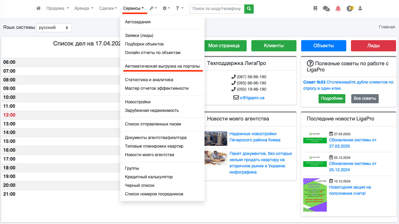 Чтобы найти ссылку на Ваш XML файл в системе - перейдите в пункт «Сервисы - Автоматическая выгрузка на порталы» (Рис. 1221).