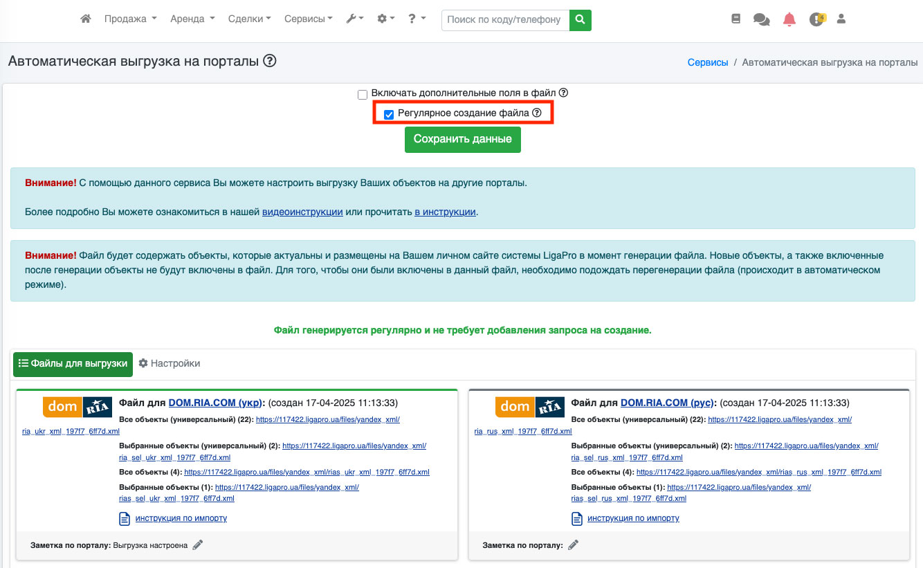 Если на открывшейся странице (Рис. 1222) еще нет списка файлов - поставьте галочку «Регулярное создание файла» и нажмите кнопку «Сохранить настройки». В течении дня файлы будут сгенерированы.