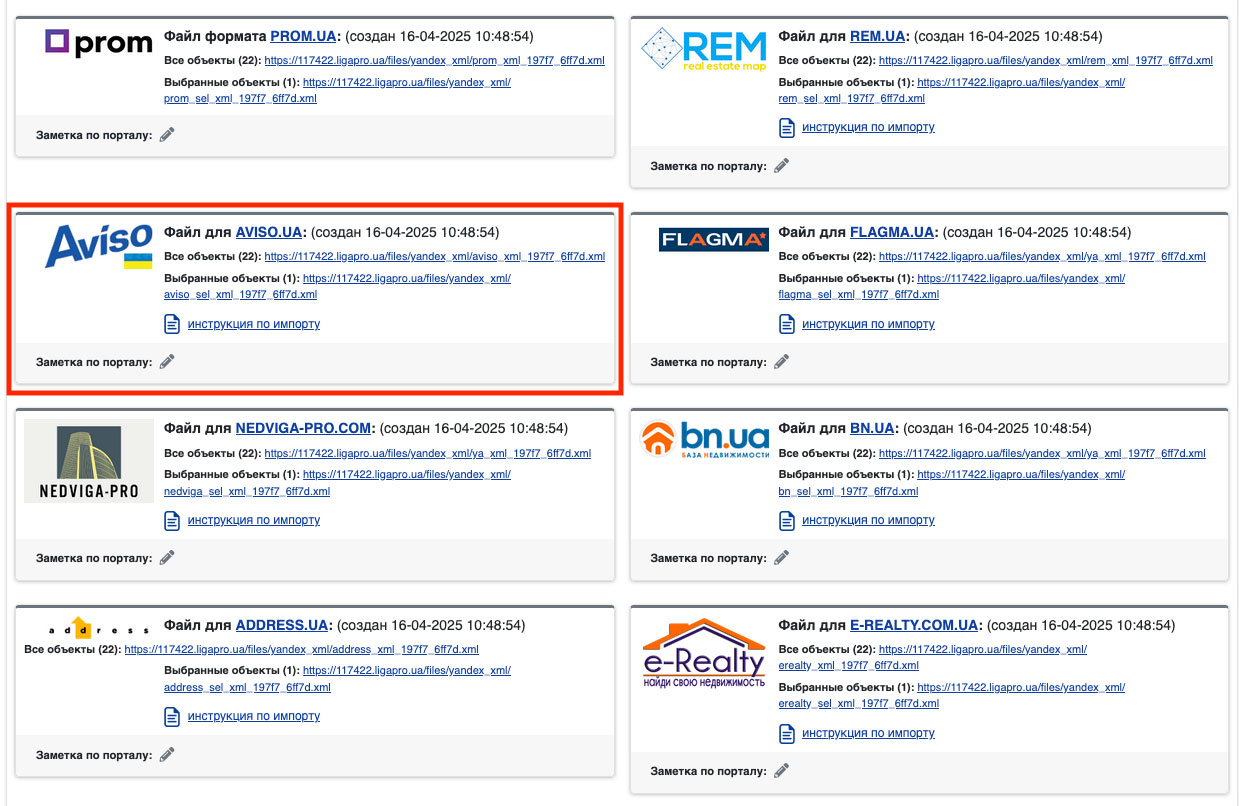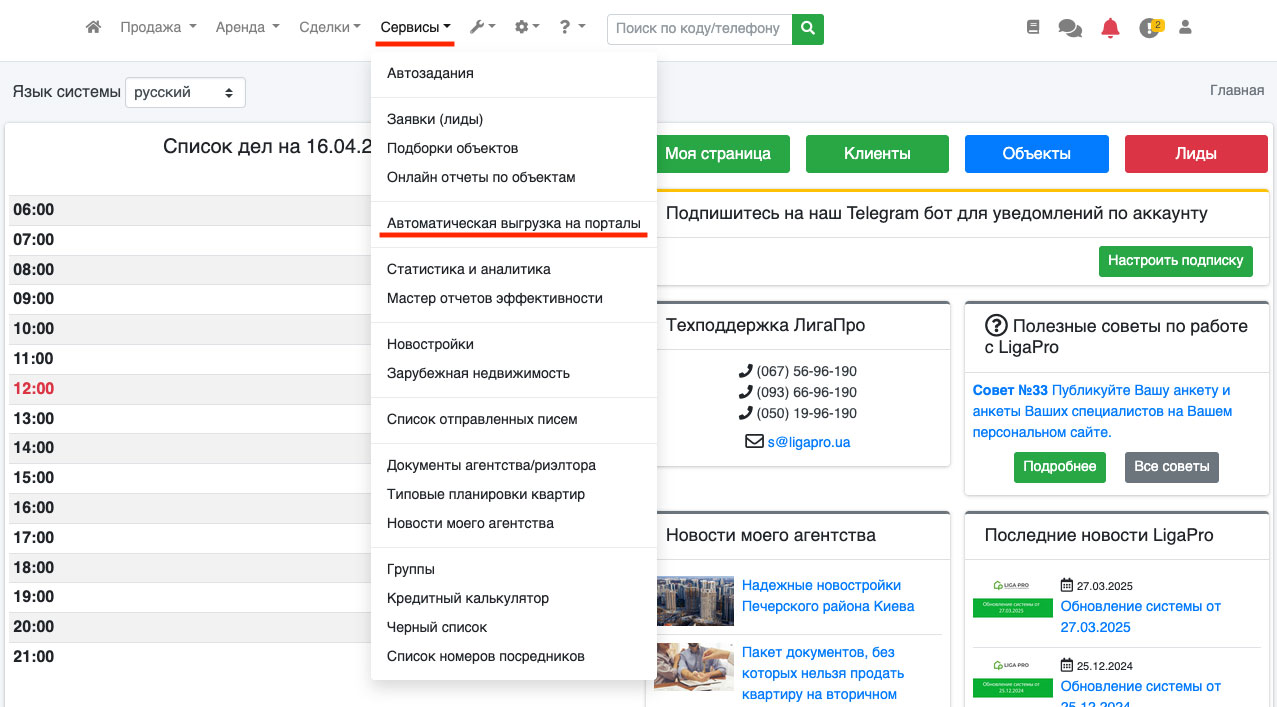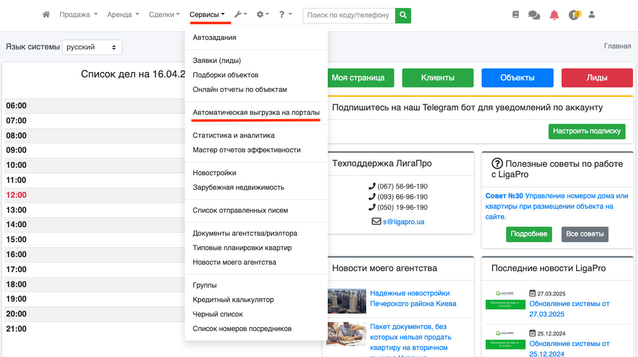 Чтобы найти ссылку на Ваш XML файл в системе LigaPro - перейдите в пункт «Сервисы - Автоматическая выгрузка на порталы» (Рис. 1083).