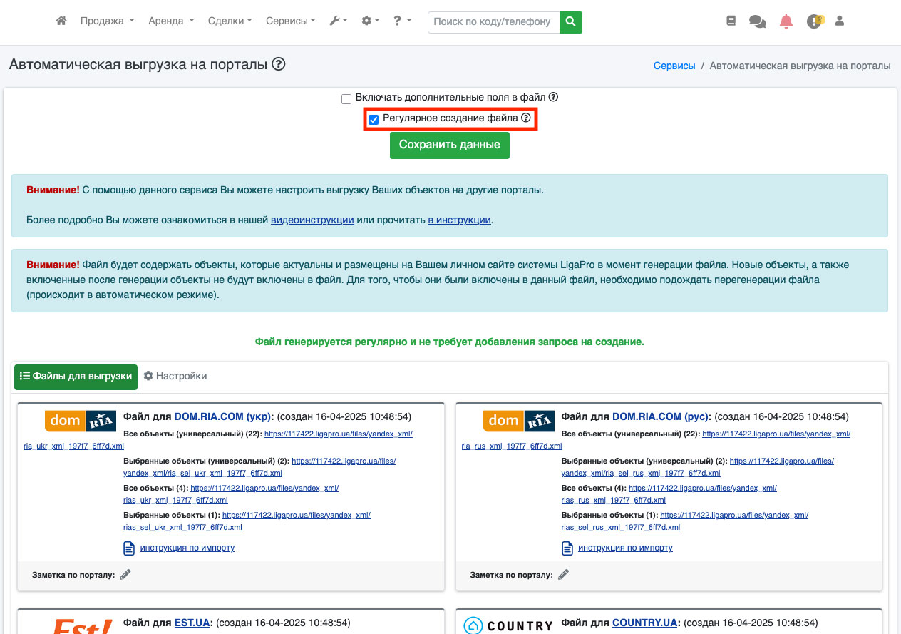Если на открывшейся странице (Рис. 1084) еще нет списка файлов - поставьте галочку «Регулярное создание файла» и нажмите кнопку «Сохранить настройки». В течении дня файлы будут сгенерированы.