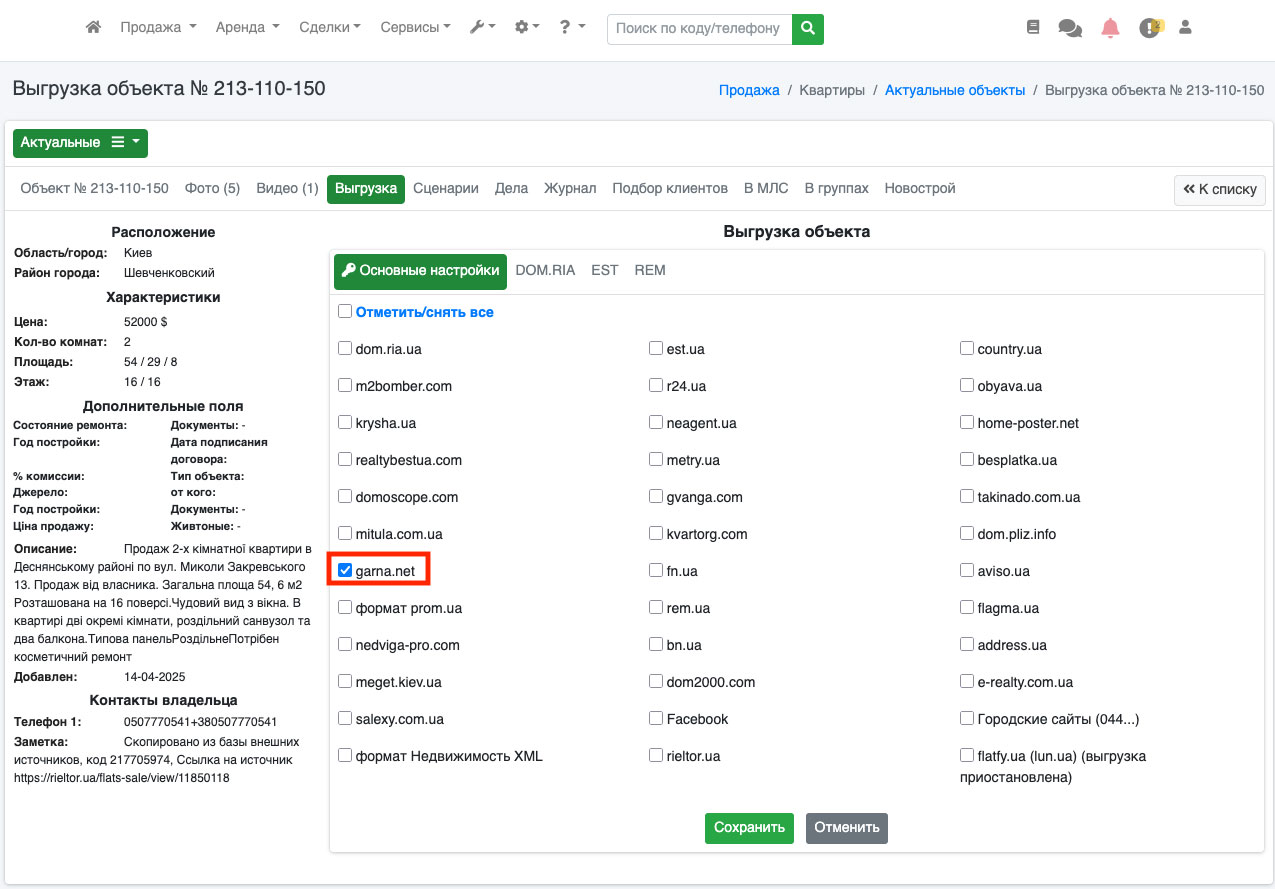 Если Вы отправили файл с выбранными объектами - также необходимо в редактировании объекта на вкладке «Выгрузка XML» поставить галочку напротив портала address.ua и нажать кнопку «Сохранить». После этого объект попадает в файл с выбранными объектами и публикуется на address.ua (Рис. 1088).