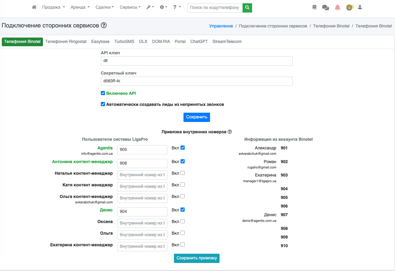 Для початку синхронізації Вам необхідно уточнити у менеджера Binotel наступні параметри: API ключ і Секретний ключ.