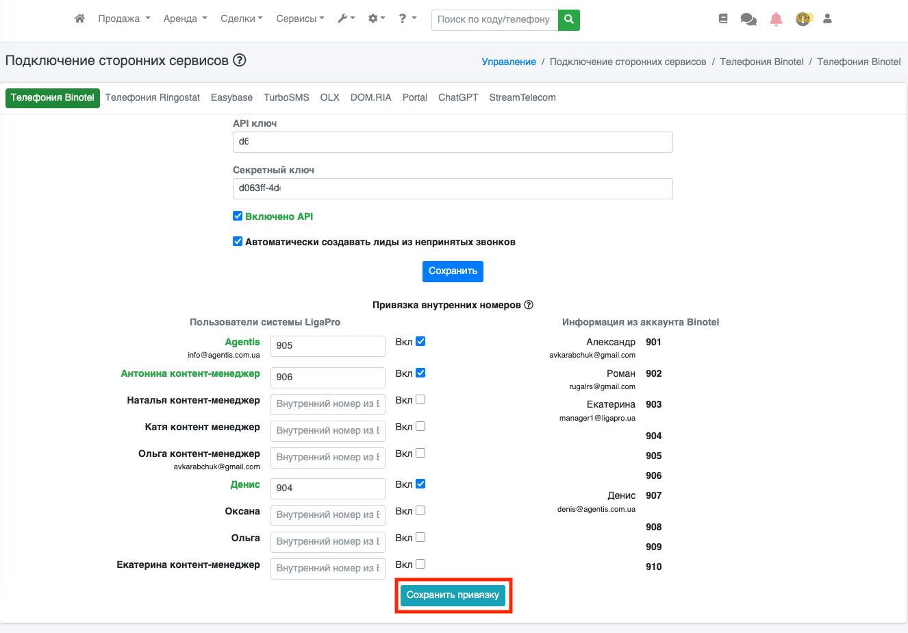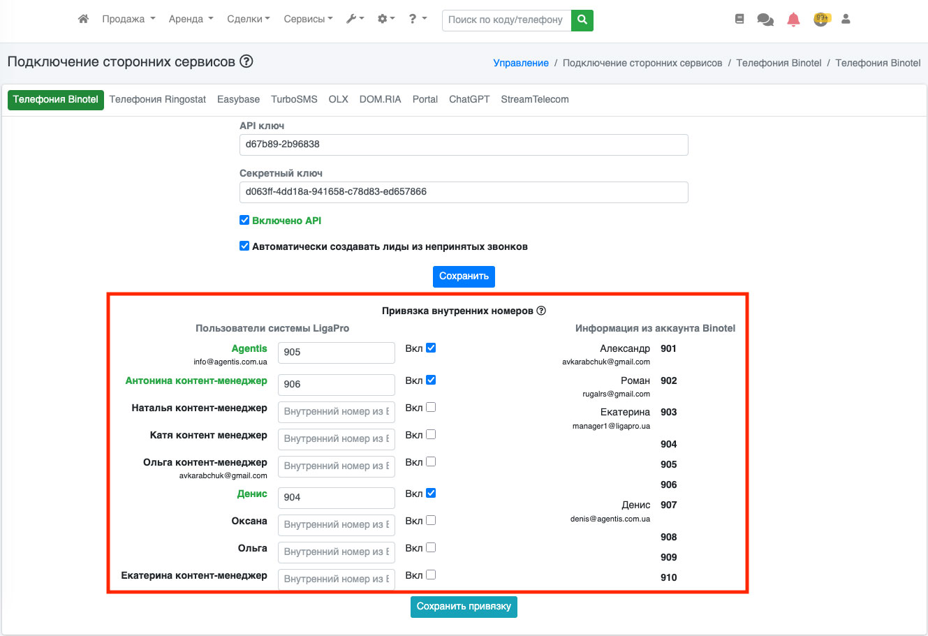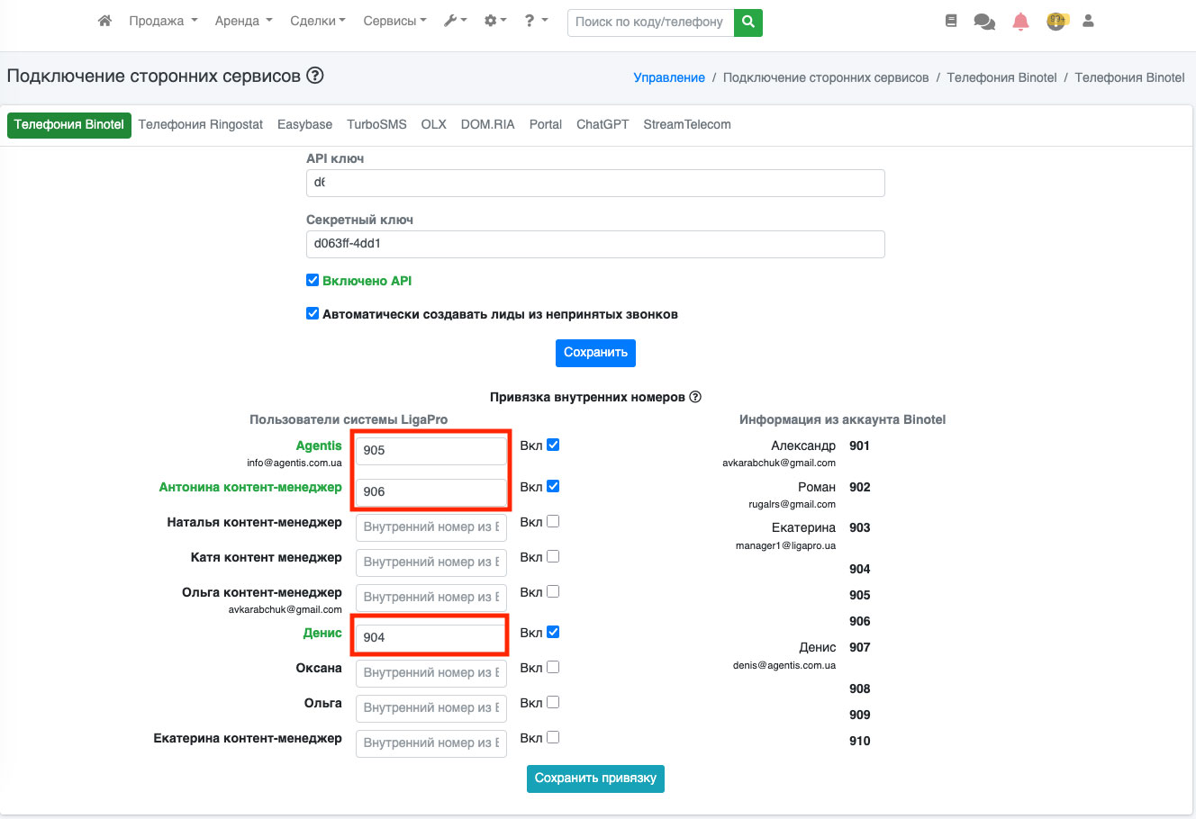 З лівої сторони у Вас відображаються користувачі аккаунта ЛігаПро, а з правої - користувачі аккаунта Binotel. Щоб IP телефонія працювала правильно - Вам необхідно навпроти аккаунту користувача ЛігаПро вписати номер відповідної лінії в акаунті Binotel (Рис. 1238). Це необхідно для того, щоб користувачі ЛігаПро могли здійснювати дзвінки прямо з CRM LigaPro, використовуючи Binotel.