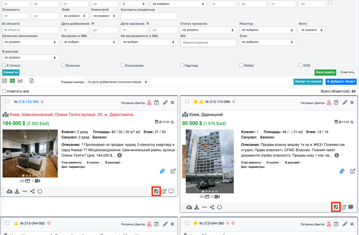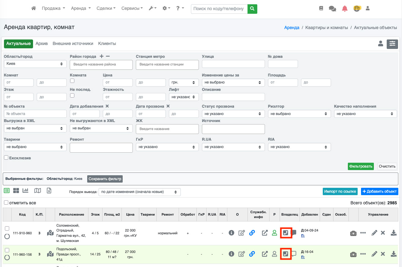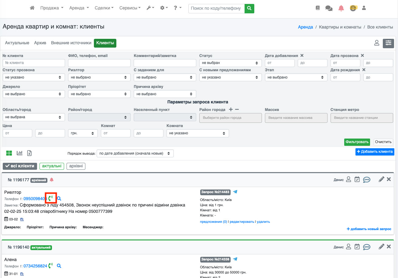 Ви можете дзвонити прямо зі списку об'єктів. Просто натисніть на зелену іконку телефону власника (Рис. 1240).