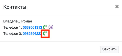 Перейдіть в форму редагування об'єкта і в службовій інформації натисніть на іконку «зелена трубка телефону» біля потрібного номера (Рис. 1244).