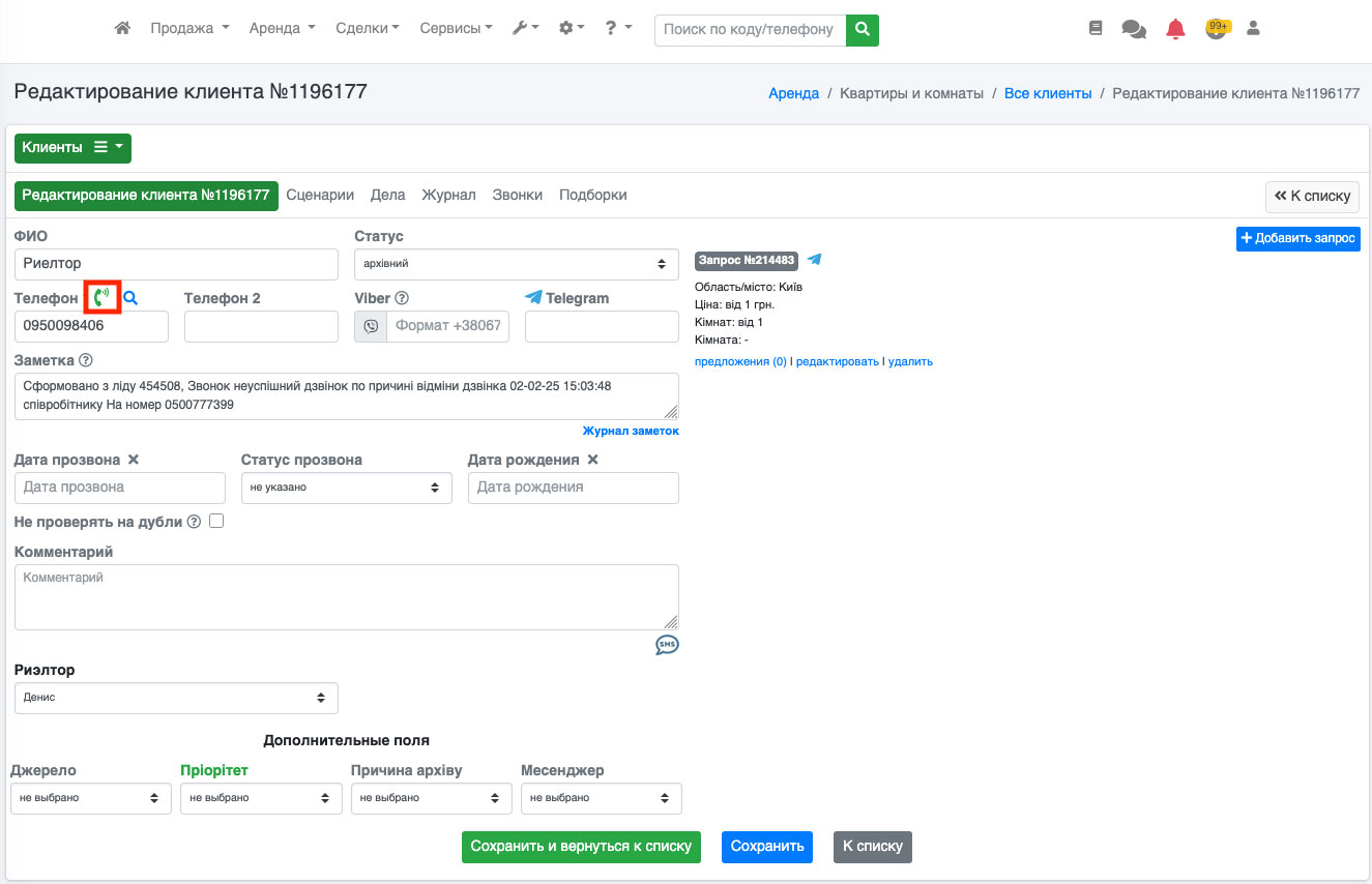 Перейдіть в форму редагування клієнта і натисніть на іконку «зелена трубка телефону» біля потрібного номера (Рис. 1250).
